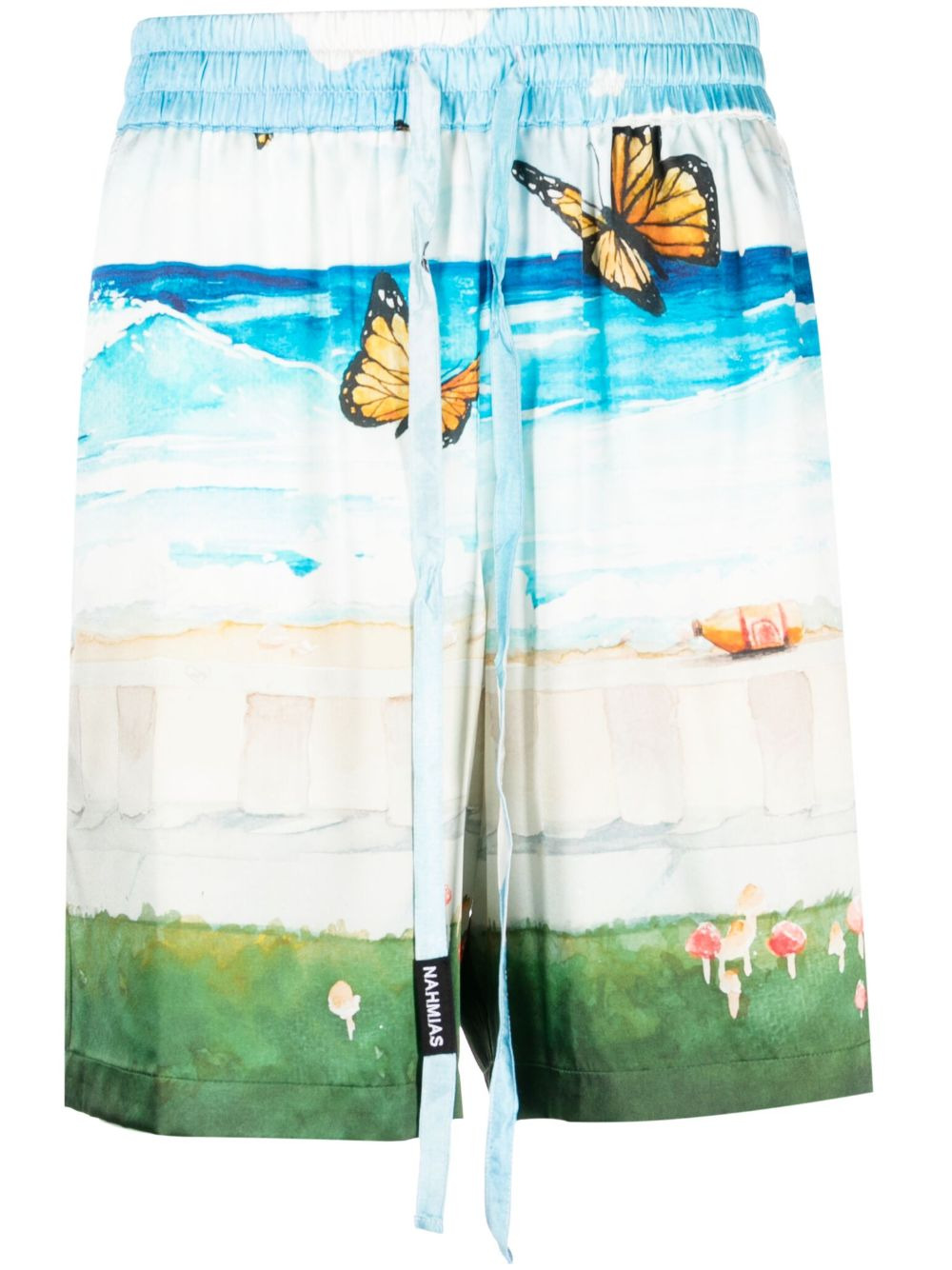 Butterfly Beach Silk Shorts blue/multicolour silk blend butterfly beach print elasticated drawstring waistband two diagonal pockets to the sides rear patch pocket above-knee length Made in United States Composition Outer: Silk 95%, Spandex/Elastane 5% Lining: Polyester 100% SIZE & FIT Model measurements Height 6 ft 2 in(1.87 m) Bust/Chest 37 in(94 cm) Hips 33.85 in(86 cm) Waist 27.95 in(71 cm) FittingInformation Designed for a straight-leg fit, offering an unrestricted and comfortable fit over the leg The elasticated waist allows for a comfortable fit Made from a midweight stretch fabric, this piece offers elasticity and flexibility when worn This piece fits true to size – take your usual size Washing instructions Dry Clean Only
