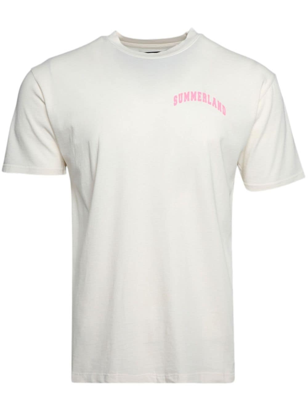 Summerland-print cotton T-shirt This T-shirt captures Nahmias’ sun-drenched aesthetic. It’s cut from off-white cotton and printed with contrasting pink 'Summerland' lettering at the front and back. Highlights - Off-white/rose pink - Cotton - Jersey texture - Slogan print to the front - Slogan print to the rear - Crew neck - Short sleeves - Straight hem Imported Composition Cotton 100%