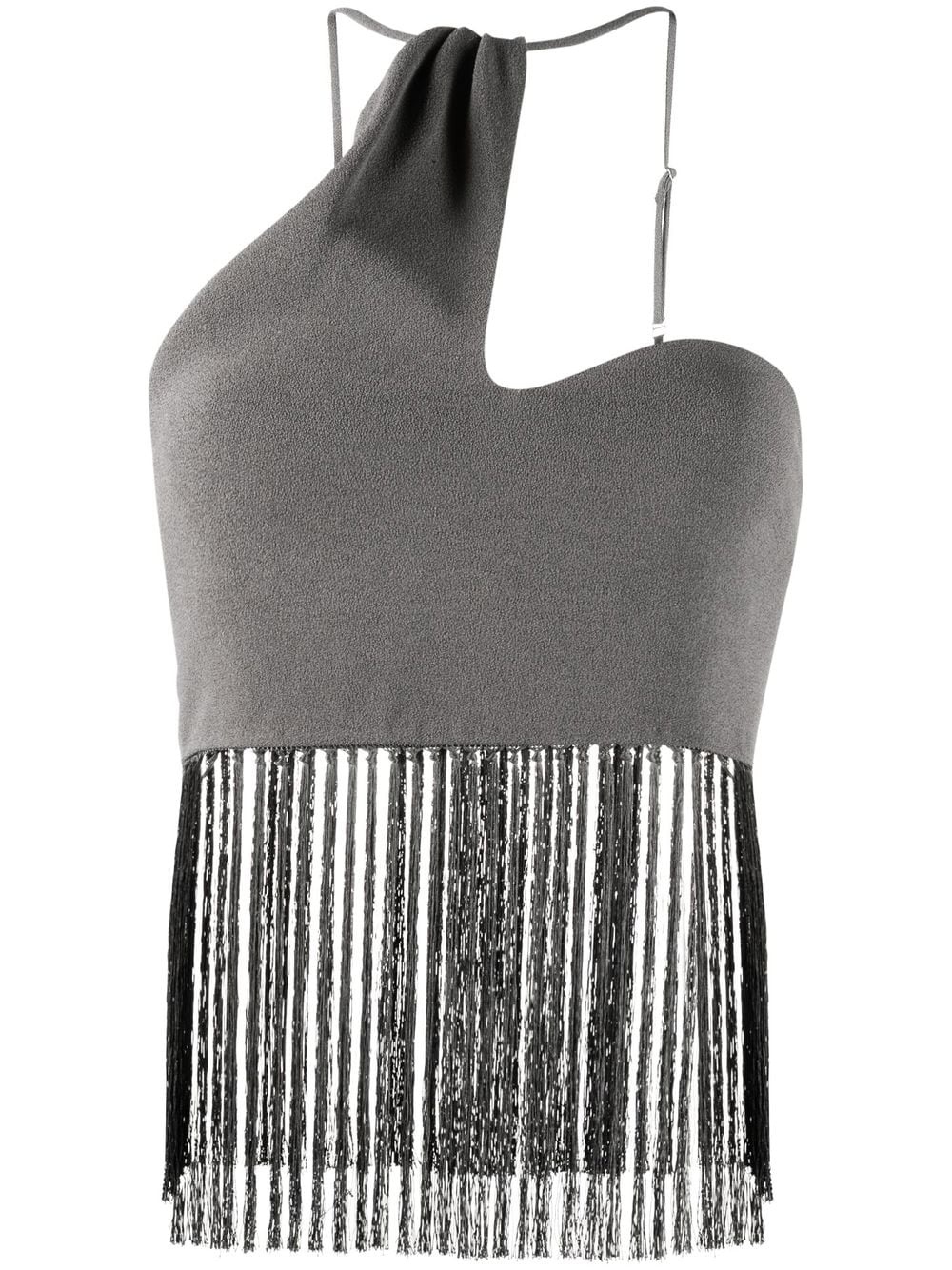 asymmetric fringed-edge top Highlights - Dark grey - Recycled polyester blend - Asymmetric neck - Halterneck - Fringed edge - Sleeveless - Low back - Spaghetti straps Imported Composition Acetate 50%, Recycled Polyester 50% SIZE & FIT Model measurements Height 5 ft 10 in(1.78 m) Bust/Chest 29.92 in(76 cm) Hips 34.64 in(88 cm) Waist 23.62 in(60 cm) Washing instructions Dry Clean Only