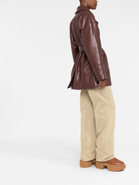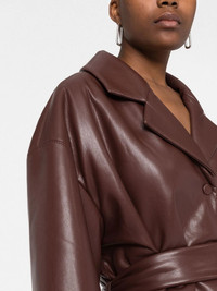 belted faux-leather blazer Balancing minimalism with a bold style, Nanushka introduces this belted blazer. In a tonal design, it is defined by its audacious brown hue and faux-leather construction. Highlights - Brown - Faux leather - Notched lapels - Drop shoulder - Chest welt pocket - Front button fastening - Long sleeves - Belted waist - Concealed front fastening Imported Composition Outer: Polyurethane 60%, Polyester 40% Lining: Viscose 100% SIZE & FIT Model measurements Height 5 ft 11 in(1.8 m) Bust/Chest 31.49 in(80 cm) Hips 36.61 in(93 cm) Waist 24.4 in(62 cm) Measurement SLEEVE LENGTH 21.65 in(55 cm) Shoulder Width 23.22 in(59 cm) LENGTH 31.88 in(81 cm) WAIST 46.45 in(118 cm) BUST 48.03 in(122 cm) FittingInformation This piece fits true to size. We recommend you get your regular size Cut for a loose fit. Comes with an adjustable belt for a flexible fit at the waist Made with a mid-weight fabric Washing instructions Dry Clean Only