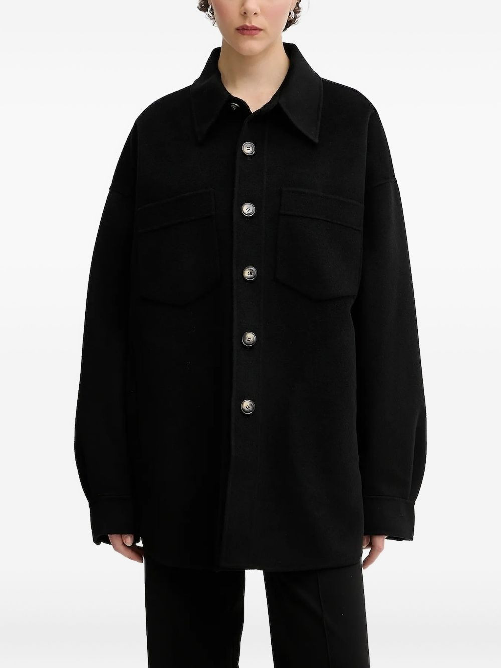 button-fastening shirt jacket Highlights - Black - Wool-silk blend - Button fastening - Collared neckline Imported Composition Wool 90%, Silk 10% Washing instructions Read Manufacturer Guidelines