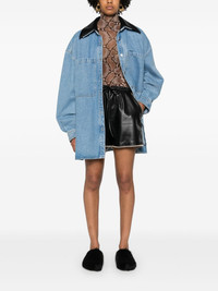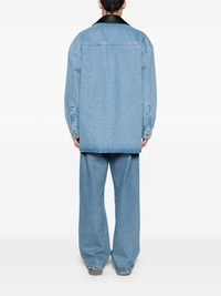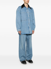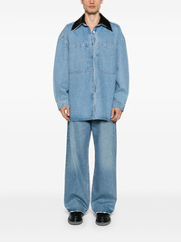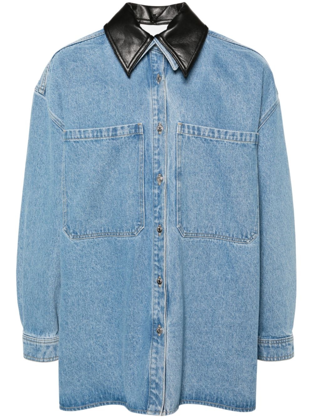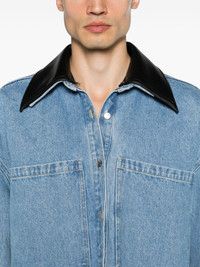 contrasting-collar denim shirt jacket Highlights - Indigo blue - Washed denim - Contrasting collar - Faux-leather paneling - Front button fastening - Drop shoulder - Long sleeves - Buttoned cuffs - Two chest patch pockets - Straight hem - When buying this unisex item, keep in mind that it is graded in standard men's sizing. Imported Composition Polyester 100%, Regenerative Cotton 100%, Polyurethane 100%, Bonded Leather 100% SIZE & FIT Model measurements Height 5 ft 10 in(1.77 m) Bust/Chest 33.07 in(84 cm) Hips 37 in(94 cm) Waist 24.8 in(63 cm) FittingInformation This unisex piece is designed for an oversized fit whether you usually select women's or men's sizes Made from a midweight fabric
