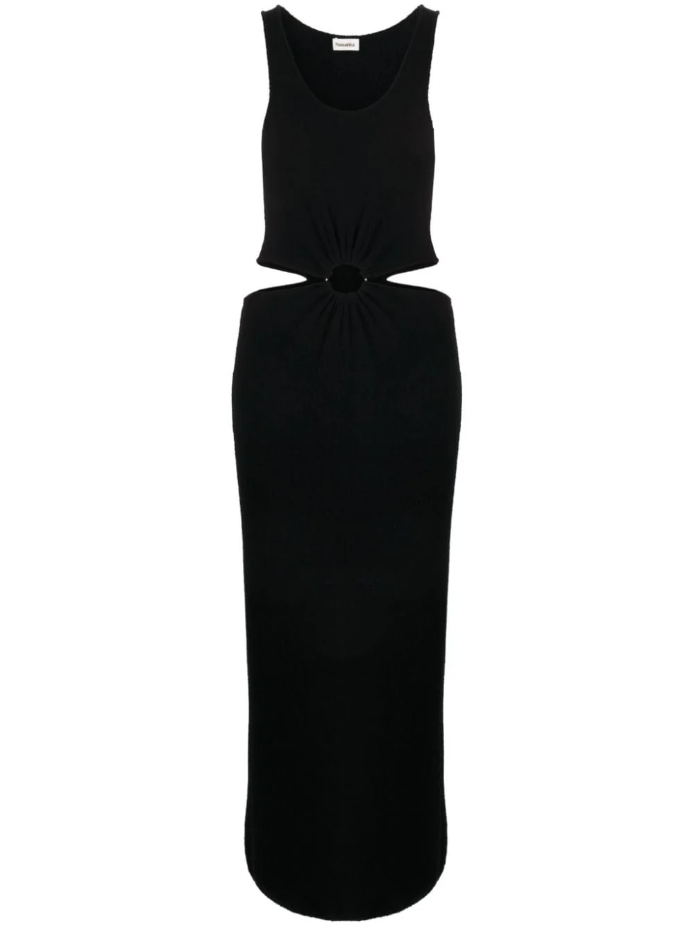 cut-out terrycloth dress Nanushka puts a tactile and skin-baring spin on the classic column silhouette of this black dress. It’s crafted in plush terrycloth blended with organic cotton with an O-ring at the cut-out waist that appears to connect the bodice and skirt while creating soft gathers through the centre. Highlights - Black - Organic cotton blend - Terry-cloth effect - Ring hardware detailing - Cut-out detailing - Gathered detailing - Round neck - Sleeveless - Mid-length - Straight hem Imported Composition Fabric 100% SIZE & FIT Model measurements Height 5 ft 10 in(1.78 m) Bust/Chest 30.7 in(78 cm) Hips 34.64 in(88 cm) Waist 23.22 in(59 cm) Washing instructions Dry Clean Only