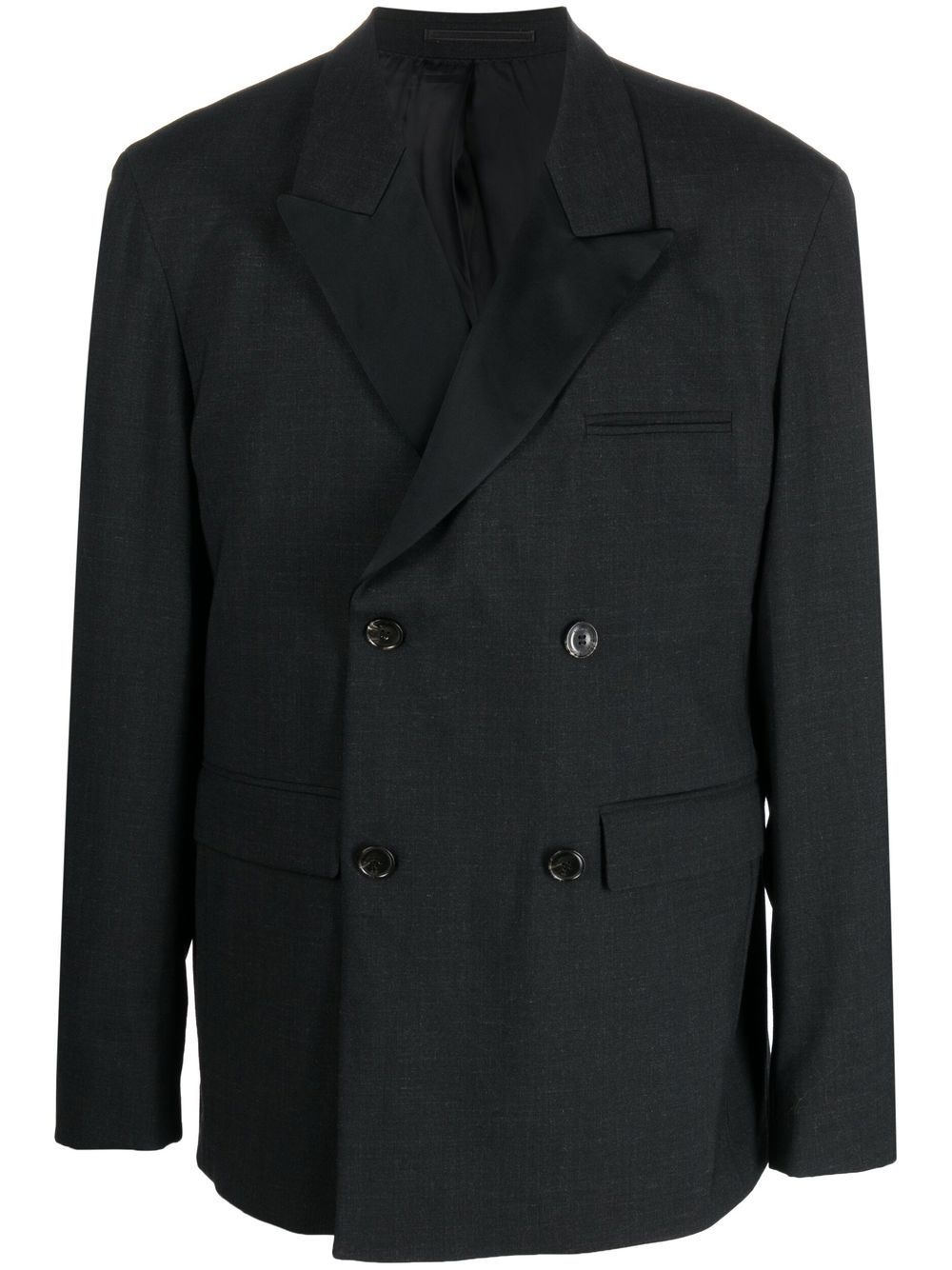 double-breasted suit jacket Highlights - Black/off-black - Notched lapels - Satin finish lapel detailing - Long sleeves - Chest welt pocket - Two side flap pockets - Central rear vent - Double-breasted button fastening - Straight hem Imported Composition Polyester 55%, Wool 45% SIZE & FIT Model measurements Height 6 ft 2 in(1.87 m) Bust/Chest 38.18 in(97 cm) Hips 36.61 in(93 cm) Waist 29.13 in(74 cm) FittingInformation This piece fits true to size. We recommend you get your regular size Cut for a loose fit Made with a mid-weight fabric Washing instructions Dry Clean Only