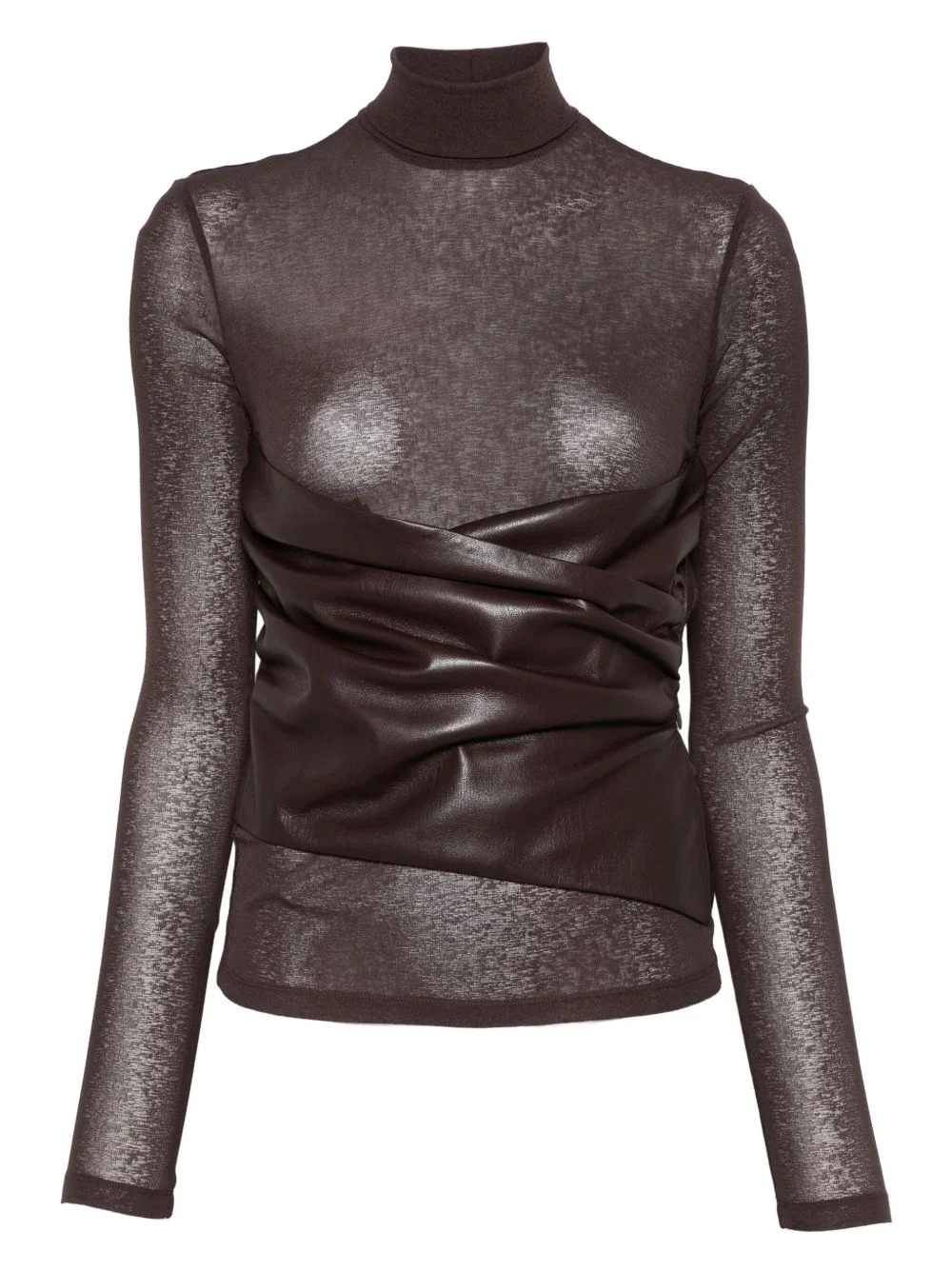 draped-panel turtleneck top Highlights - Dark brown - Turtleneck - Long sleeves - Sheer fabric - Wrapped effect Imported Composition Recycled Polyester 100% SIZE & FIT Model measurements Height 5 ft 11 in(1.8 m) Bust/Chest 32.67 in(83 cm) Hips 36.22 in(92 cm) Waist 24.4 in(62 cm) Washing instructions Machine Wash