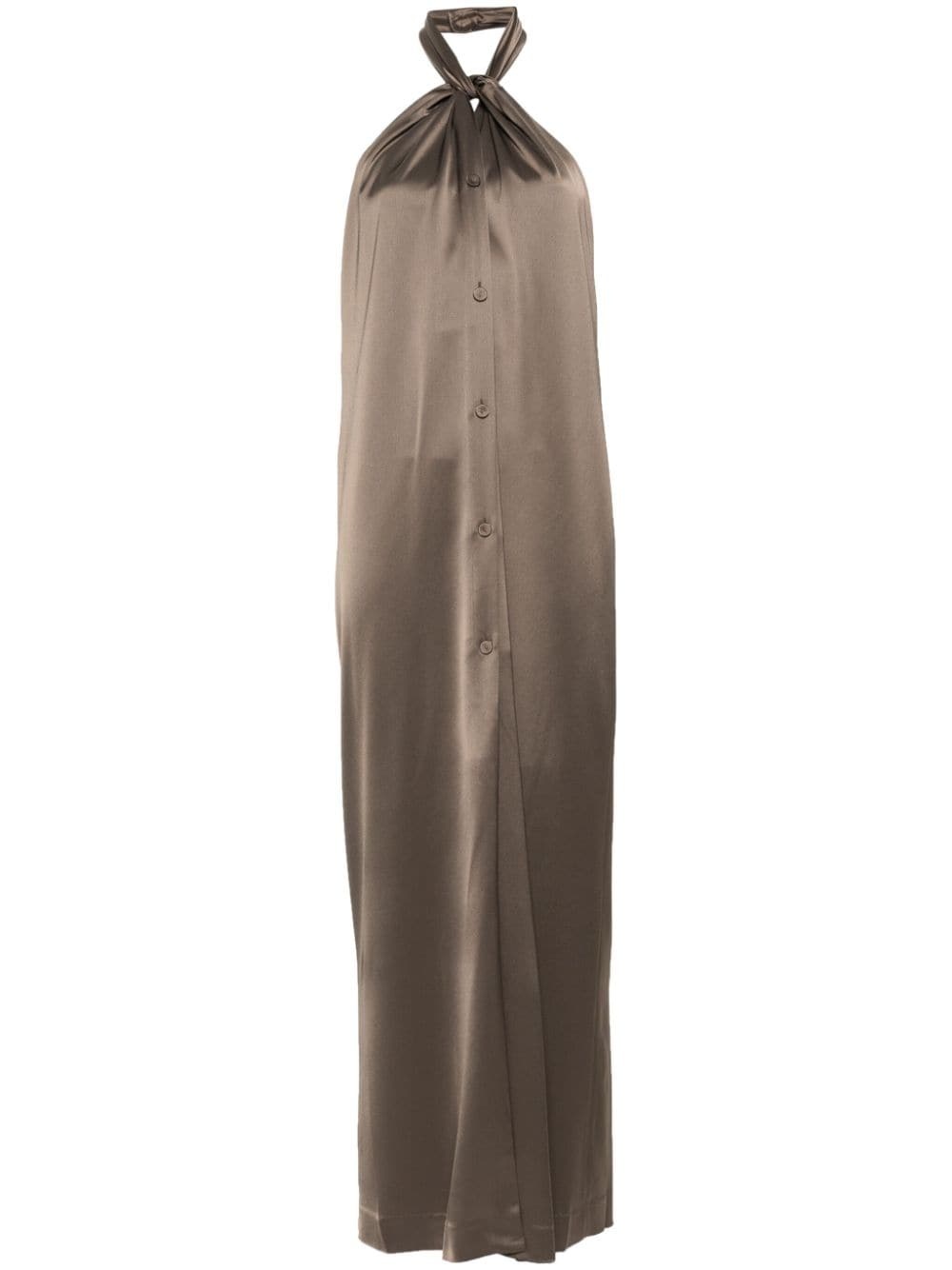 Elima satin halterneck dress Nanushka’s Elima dress is cut from glossy satin to a halterneck silhouette, reflecting the brand’s penchant for streamlined designs. It’s traced with tonal buttons and falls to an ankle length. Highlights - Olive green - Satin weave - Halterneck - Front button fastening - Sleeveless - Front slit - Open back - Straight hem Imported Composition Acetate 81%, Polyester 19%
