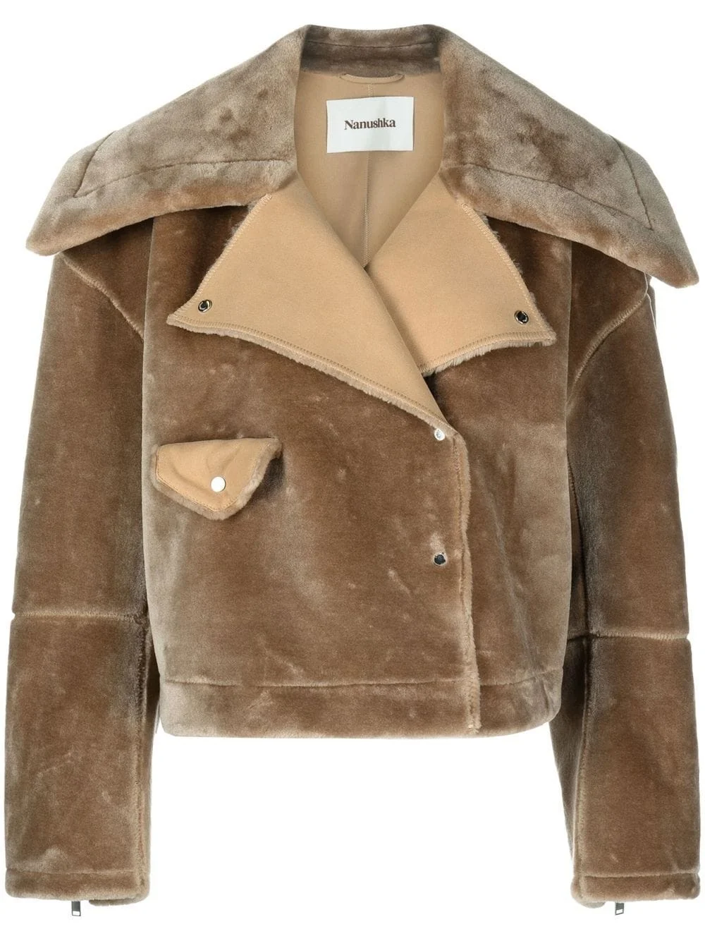 faux-fur biker jacket Nanushka reimagines the classic biker jacket. This neutral-hued version is crafted from panels of faux leather for an updated twist. Imported Composition Polyester film fiber 85%, Polyurethane 15% SIZE & FIT Model measurements Height 5 ft 10 in(1.77 m) Bust/Chest 31.49 in(80 cm) Hips 35.03 in(89 cm) Waist 23.22 in(59 cm) FittingInformation This piece fits true to size. We recommend you get your regular size Cut for a loose fit Made with a mid-weight non-stretch fabric Washing instructions Dry Clean Only
