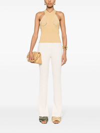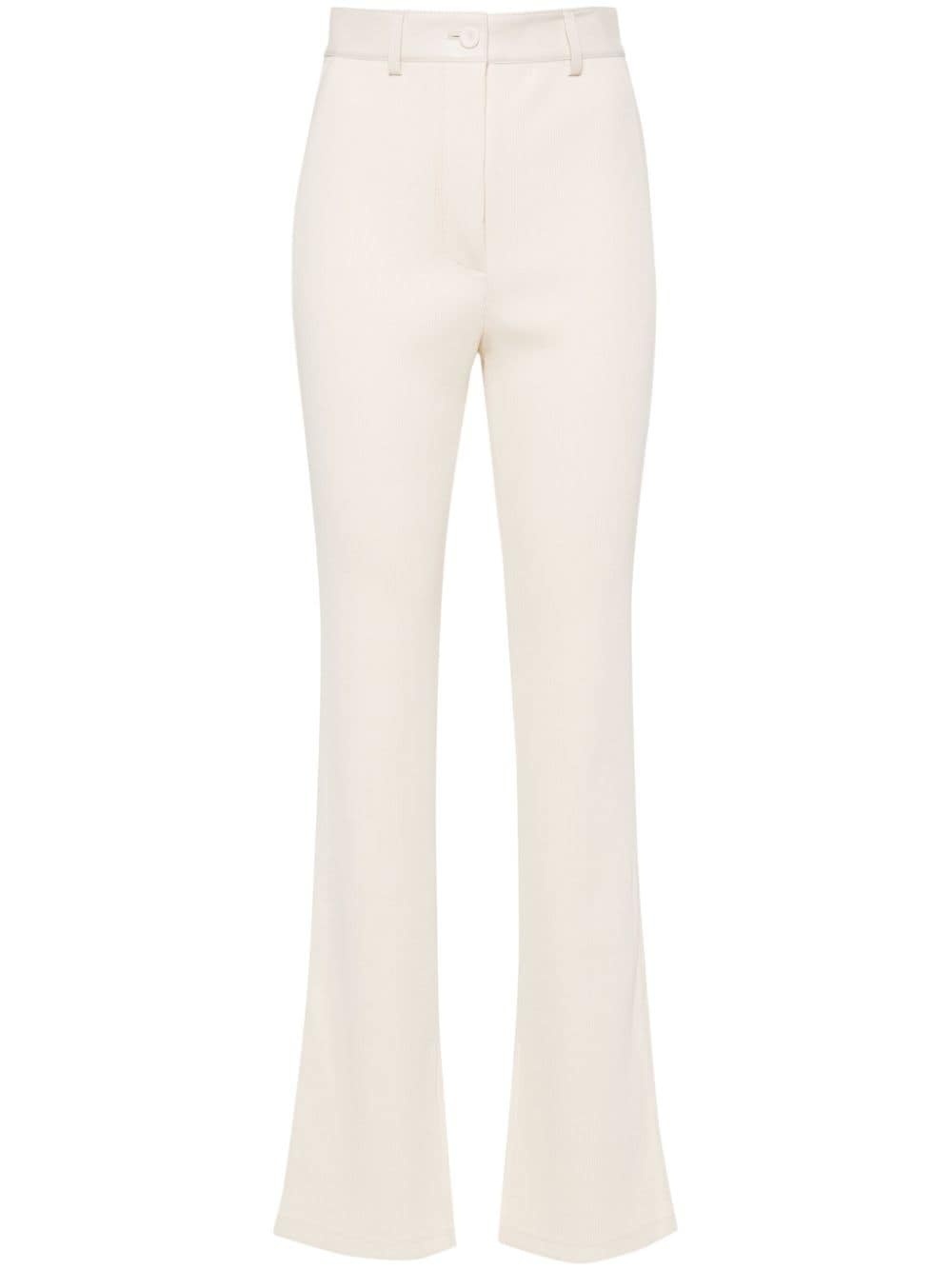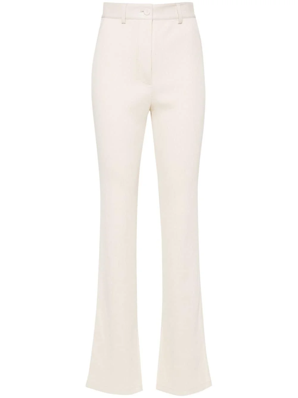 fine-ribbed bootcut trousers Highlights - Cream white - Organic cotton - Fine ribbed - Contrasting border - Belt loops - Faux pocket detail - Two rear patch pockets - Bootcut - Front button and zip fastening Imported Composition Organic Cotton 100%, Polyurethane 100%, Polyester 100%, Bonded Leather 100% SIZE & FIT Model measurements Height 5 ft 10 in(1.78 m) Bust/Chest 33.07 in(84 cm) Hips 36.61 in(93 cm) Waist 24.8 in(63 cm) FittingInformation Designed with a flared hem, these trousers allow for a close fit at the waist with a slim fit over the leg and widening towards the hem Made from a midweight non-stretch fabric, this piece offers minimal elasticity when worn This piece fits true to size – take your usual size