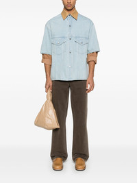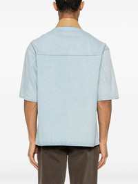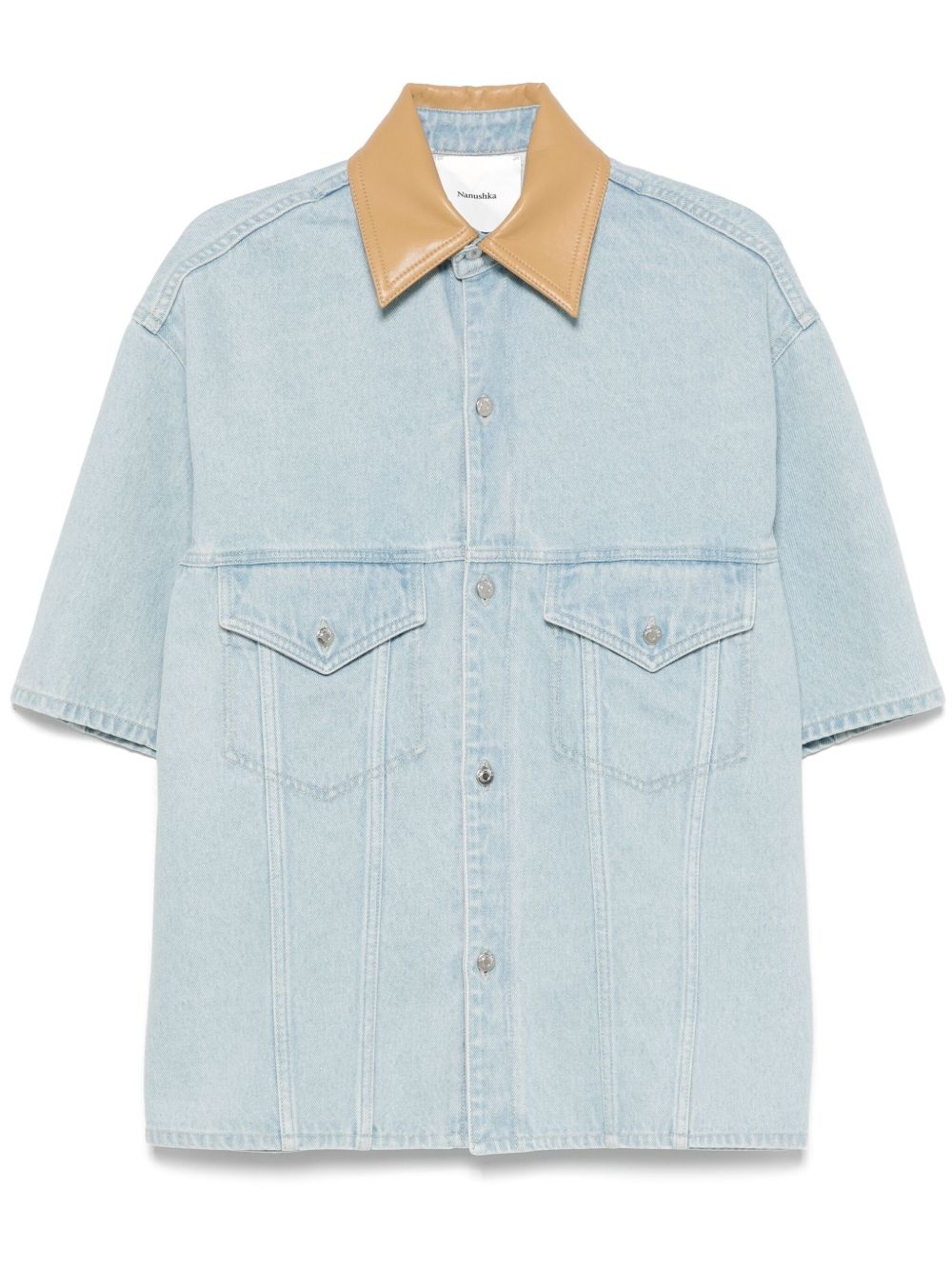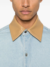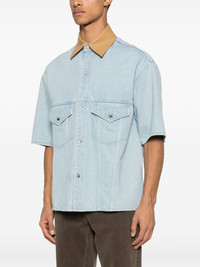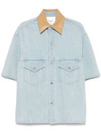 leather-collar denim shirt Highlights - Light blue - Front button fastening - Two button-fastening chest pockets - Vertical seamed - Short sleeves Imported Composition Cotton 100%, Polyurethane 100%, Calf Leather 100% SIZE & FIT Model measurements Height 6 ft 2 in(1.87 m) Bust/Chest 38.18 in(97 cm) Hips 36.61 in(93 cm) Waist 29.13 in(74 cm) FittingInformation Designed to be unstructured, offering a loose fit throughout Sturdy and hard-wearing, this denim piece offers no stretch Washing instructions Specialist Cleaning