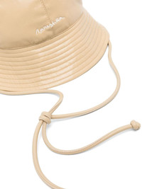 logo-embroidered faux-leather bucket hat Nanushka ensures the notability of this panelled faux-leather bucket hat by applying its logo in a contrast embroidery to the front of the design. Highlights - Beige - Faux leather - Embroidered logo to the front - Panelled design - Flexible brim - Drawstring fastening Imported Composition Polyurethane 100%, Recycled Polyester 100% SIZE & FIT Measurement BRIM 2.55 in(6.5 cm) CIRCUMFERENCE 22.04 in(56 cm)