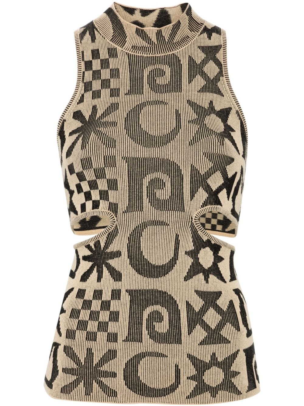 Maraj tank top Highlights - Beige/black - Organic cotton - Ribbed knit - Patterned jacquard - Cut-out detailing - Mock neck - Sleeveless - Racerback - Straight hem Imported Composition Organic Cotton 100% SIZE & FIT Model measurements Height 5 ft 10 in(1.78 m) Bust/Chest 33.07 in(84 cm) Hips 36.61 in(93 cm) Waist 24.8 in(63 cm) FittingInformation Designed for a close fit throughout Made from a midweight stretch fabric, this piece offers elasticity and flexibility when worn Washing instructions Dry Clean Only