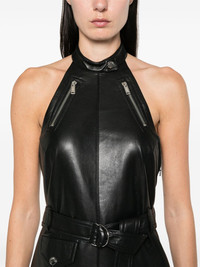 Minnow midi dress Highlights - Black - Leather - Smooth grain - Concealed side zip fastening - Halterneck - Sleeveless - Zip details - Detachable waist belt - Front flap pocket - Open back - Rear slit - Full lining - Column silhouette - Straight hem - Mid-length Imported Composition Outer: Polyurethane 100%, Polyester 100% Lining: Bonded Leather 100%, Polyester 80%, Polyamide 20% SIZE & FIT Model measurements Height 5 ft 10 in(1.78 m) Bust/Chest 33.46 in(85 cm) Hips 36.22 in(92 cm) Waist 23.22 in(59 cm) FittingInformation Designed for a slim fit that sits just away from the body offering a close yet comfortable fit Soft leather has a supple and smooth construction offering some flexibility