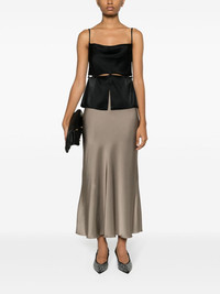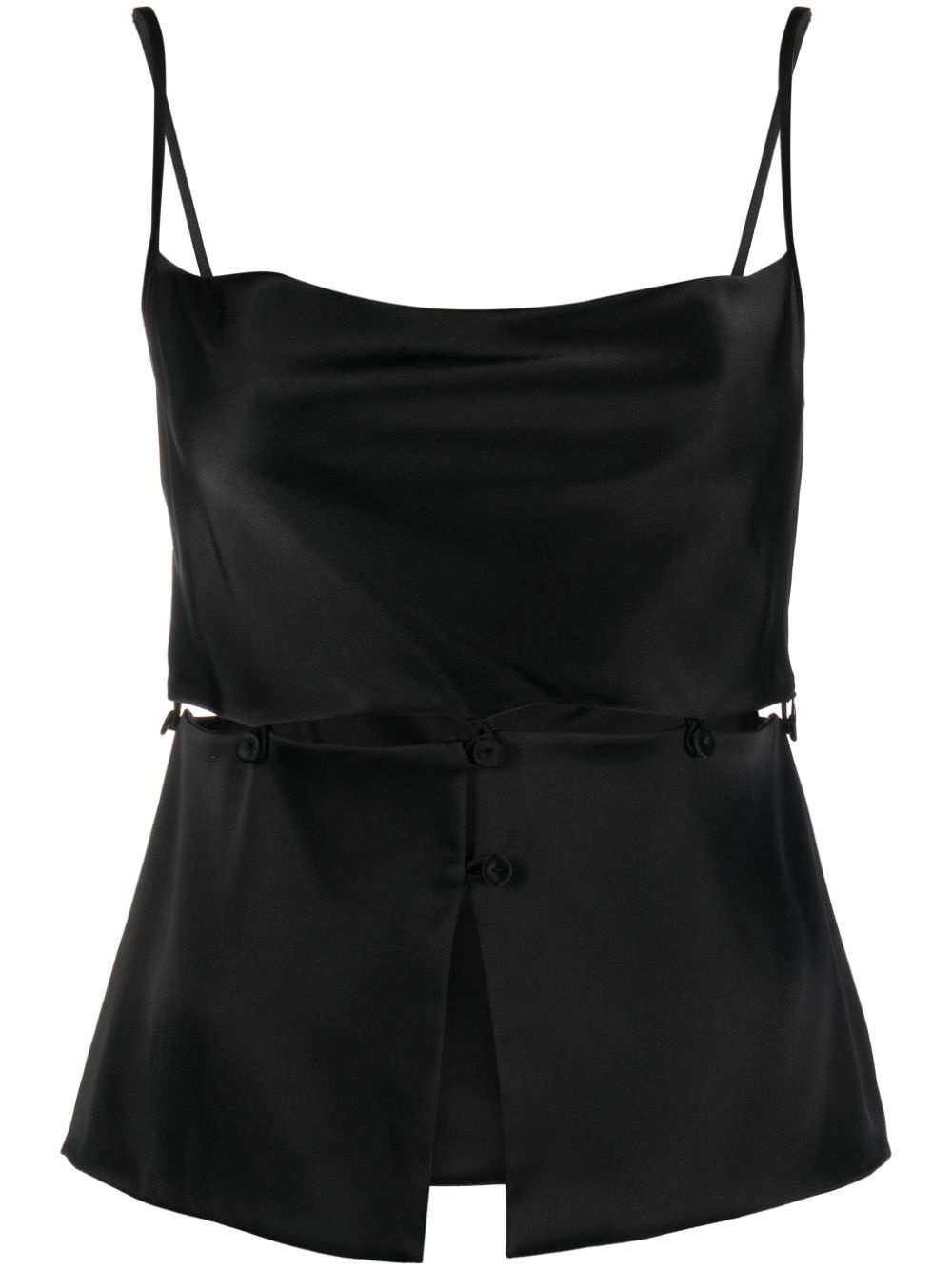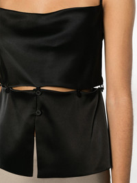 modular peplum-waist satin tank top Highlights - Black - Satin weave - Fabric-covered buttons - Cowl neck - Adjustable spaghetti straps - Concealed side zip fastening - Button fastening peplum waist - Straight hem Imported Composition Acetate 81%, Recycled Polyester 19% SIZE & FIT Model measurements Height 5 ft 10 in(1.78 m) Bust/Chest 32.67 in(83 cm) Hips 35.43 in(90 cm) Waist 23.22 in(59 cm) FittingInformation Made from a midweight fabric