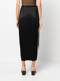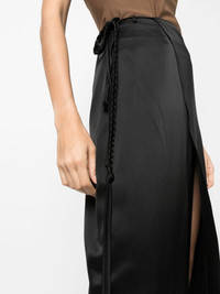 Racha wrap skirt Defined by its lustrous satin construction, the Racha skirt showcases Nanushka's affinity for sleek contemporary styles. It fastens at the waist with braided self-ties and falls to a straight silhouette interrupted by a high-cut side split. Highlights - Black - Satin finish - High-waisted - Wrap design - Side tie fastening - Side slit - Mid-calf length Imported Composition Acetate 81%, Recycled Polyester 19% SIZE & FIT Model measurements Height 5 ft 9 in(1.75 m) Bust/Chest 33.07 in(84 cm) Hips 35.03 in(89 cm) Waist 24.01 in(61 cm) Measurement HIPS 34.64 in(88 cm) LENGTH 35.43 in(90 cm) WAIST 23.62 in(60 cm) Washing instructions Machine Wash