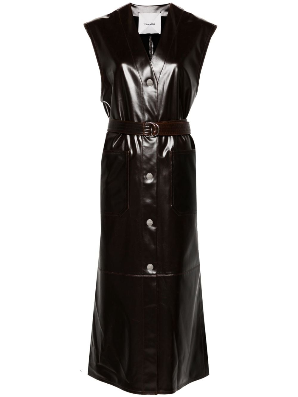 Rainey sleeveless coat Highlights - Havana brown - Faux leather - V-neck - Front press-stud fastening - Side press-stud fastening - Sleeveless - Two front patch pockets - Detachable belt - Mid-length - Straight hem - Full lining Imported Composition Lining: Polyurethane 50%, Polyamide 50% Outer: Polyurethane 60%, Polyester 40% SIZE & FIT Model measurements Height 5 ft 10 in(1.78 m) Bust/Chest 33.07 in(84 cm) Hips 36.61 in(93 cm) Waist 24.8 in(63 cm) FittingInformation The belt offers adjustability for fitted preferences Made from a midweight non-stretch fabric, this piece offers minimal elasticity when worn