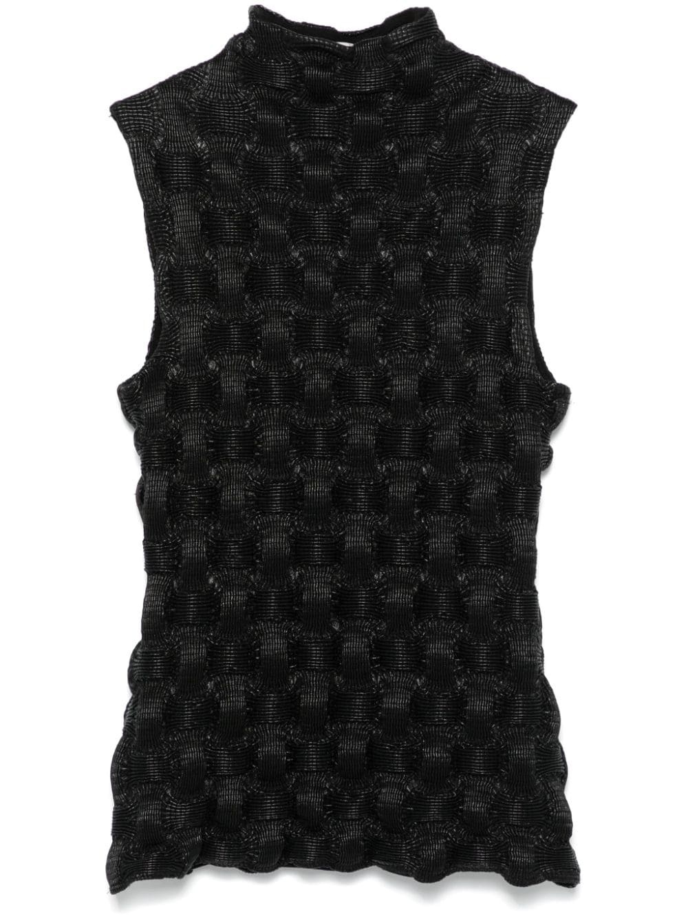 roll-neck sleeveless top Highlights - Black - Faux leather - Check pattern - Roll neck - Sleeveless - Full lining - Straight hem Imported Composition Recycled Polyester 100%, Polyurethane 100% SIZE & FIT Model measurements Height 5 ft 10 in(1.78 m) Bust/Chest 33.46 in(85 cm) Hips 36.22 in(92 cm) Waist 23.22 in(59 cm) FittingInformation Designed for a slim fit that sits just away from the body offering a close yet comfortable fit Made from a lightweight non-stretch fabric, this piece offers minimal elasticity when worn