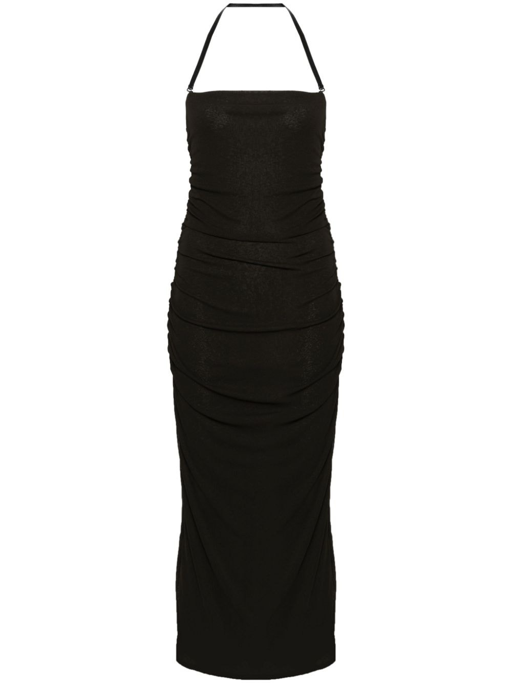 ruched halterneck midi dress Highlights - Anthracite grey - Recycled polyester - Cady texture - Ruched detailing - Cowl neck - Halterneck - Straight hem - Mid-length Imported Composition Recycled Polyester 100% SIZE & FIT Model measurements Height 5 ft 11 in(1.8 m) Bust/Chest 31.49 in(80 cm) Hips 35.82 in(91 cm) Waist 24.8 in(63 cm) FittingInformation Designed for a close fit throughout The detachable straps offer an alternate way to wear this piece Made from a midweight non-stretch fabric, this piece offers minimal elasticity when worn Washing instructions Dry Clean Only