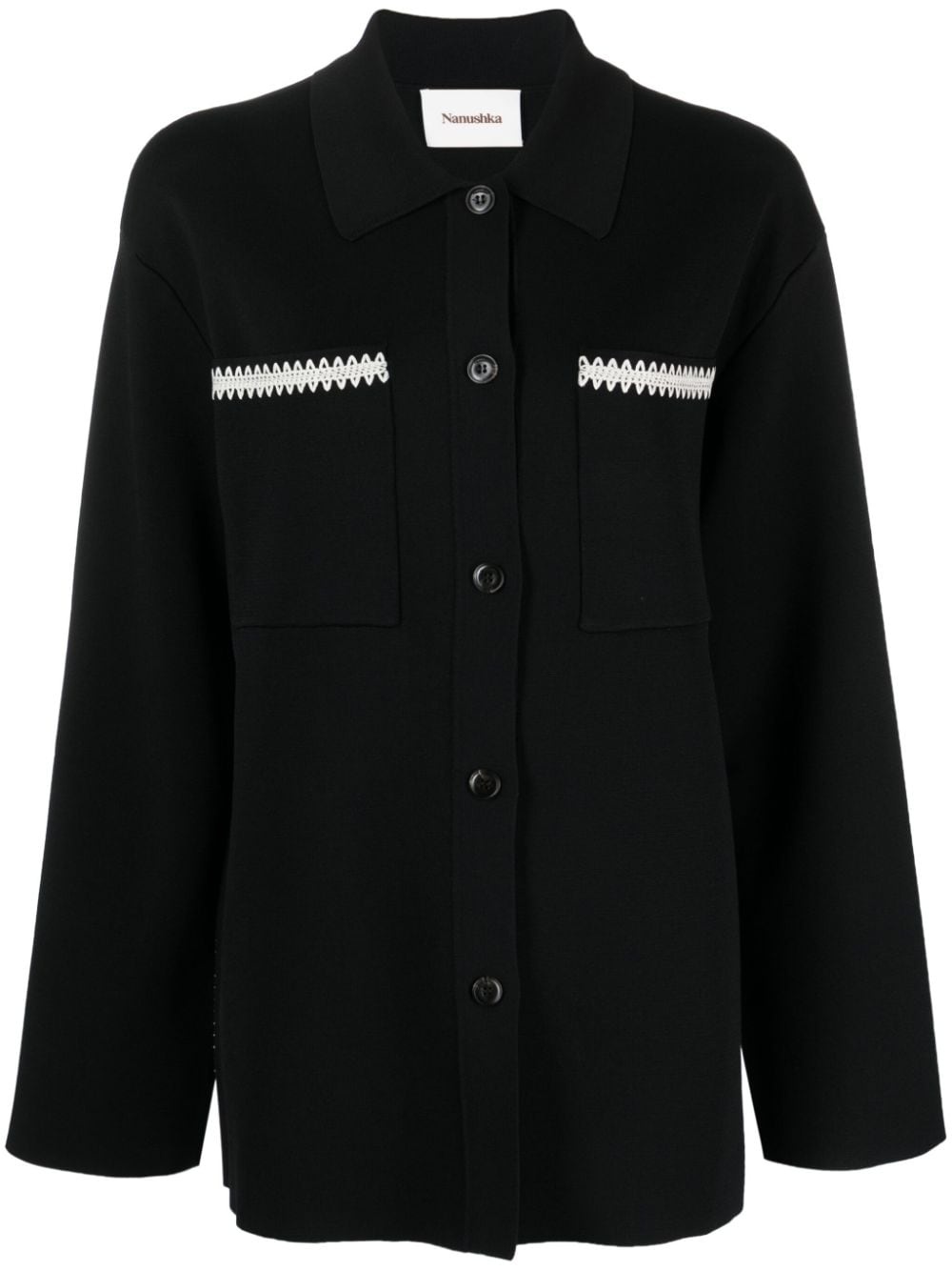 Silvia crochet-trim shirt Nanushka spotlights its affinity for traditional craft with this Silvia shirt, thanks to the contrasting crochet trims that decorate the chest. It’s cut to a boxy silhouette and framed with a classic collar. Highlights - Black/cream white - Recycled viscose blend - Crochet trim - Classic collar - Two chest patch pockets - Front button fastening - Long sleeves - Straight hem Imported Composition Recycled Viscose 52%, Recycled Polyamide 46%, Recycled Elastane 2% SIZE & FIT Model measurements Height 5 ft 10 in(1.78 m) Bust/Chest 32.67 in(83 cm) Hips 35.43 in(90 cm) Waist 23.22 in(59 cm) Measurement SLEEVE LENGTH 18.89 in(48 cm) LENGTH 29.13 in(74 cm) WAIST 43.3 in(110 cm) BUST 43.3 in(110 cm) Shoulder Width 19.68 in(50 cm) FittingInformation Designed for an oversized fit, offering additional room throughout Made with a midweight knit, this piece offers some stretch This piece fits true to size – take your usual size Washing instructions Hand Wash