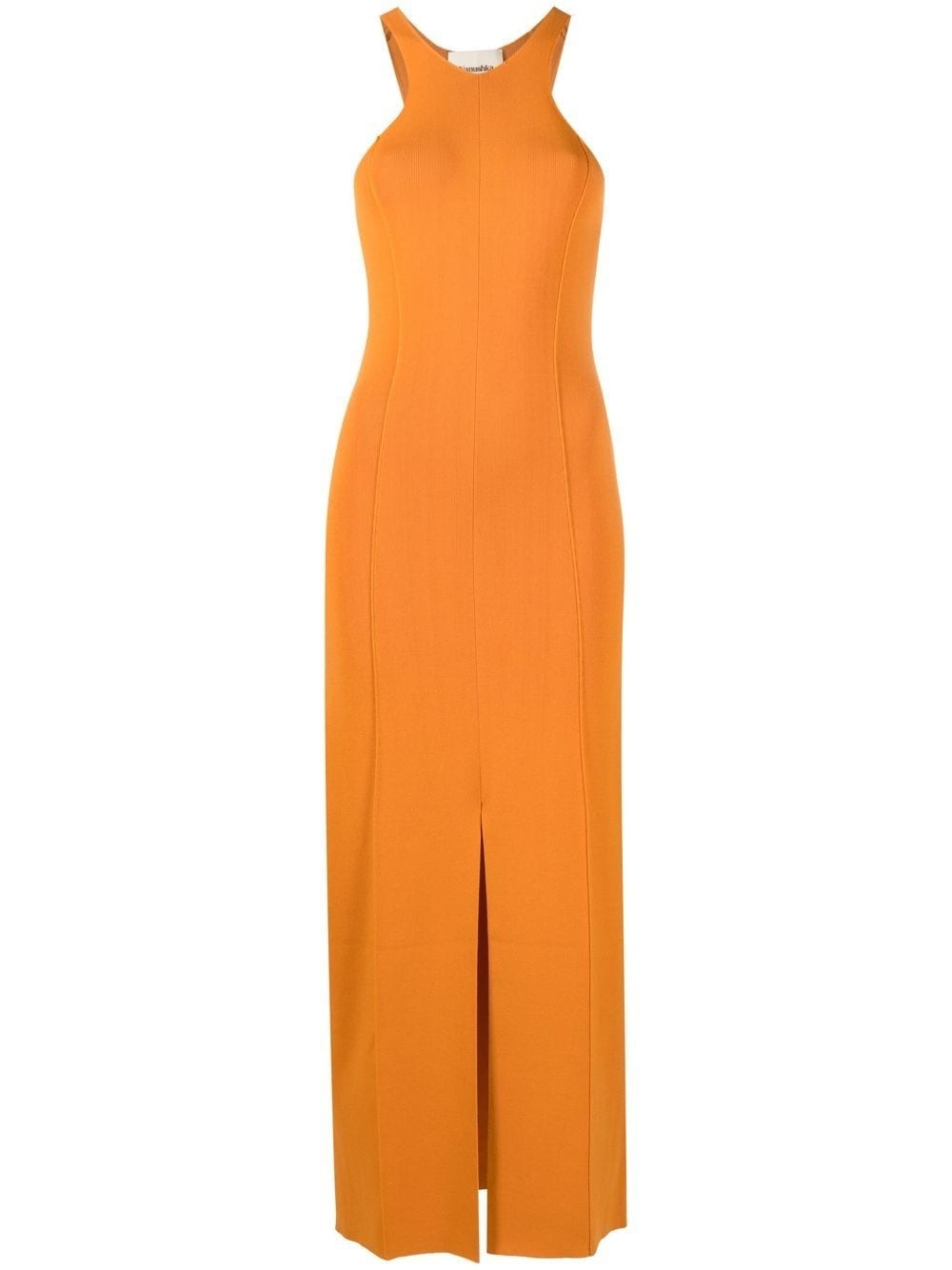 sleeveless fitted midi dress Realised in a vibrant orange hue, this fitted midi dress from Nanushka hugs from the neckline to the hips, creating a seamless silhouette. A high front slit adds a subtle hint of drama. Highlights - Orange - Seam detailing - High neck - Sleeveless - Racerback - Front slit - Mid-length - Stretch-design Imported Composition Viscose 63%, Nylon 37% SIZE & FIT Model measurements Height 5 ft 10 in(1.77 m) Bust/Chest 31.49 in(80 cm) Hips 33.85 in(86 cm) Waist 22.44 in(57 cm)