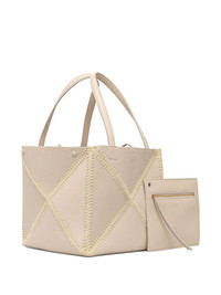 The Origami tote bag Highlights - Beige - Tie-fastening straps - Two flat top handles - Folded design - Removable pouch Imported Composition Lining: Polyurethane 50%, Polyamide 50% Outer: Polyester 100%, Cotton 100%, Polyurethane 100%, Zamak 100% SIZE & FIT Measurement DEPTH 12.99 in(33 cm) HEIGHT 12.99 in(33 cm) WIDTH 12.99 in(33 cm)