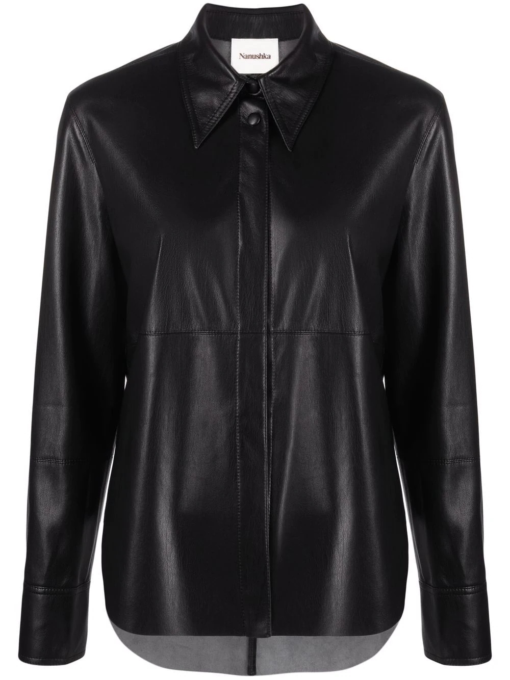 vegan-leather long-sleeve shirt NANUSHKA showcases its appreciation and respect for nature with every collection. Materials are chosen for their low-impact qualities, as proven by this vegan leather shirt. An oversized shape adds to the relaxed nature of the design. Highlights - Black - Vegan leather - Straight-point collar - Long sleeves - Press-stud fastening cuffs - Concealed front press-stud fastening Imported Composition Polyester 100%, Polyurethane 100% SIZE & FIT Model measurements Height 5 ft 11 in(1.8 m) Bust/Chest 31.49 in(80 cm) Hips 36.61 in(93 cm) Waist 24.4 in(62 cm)