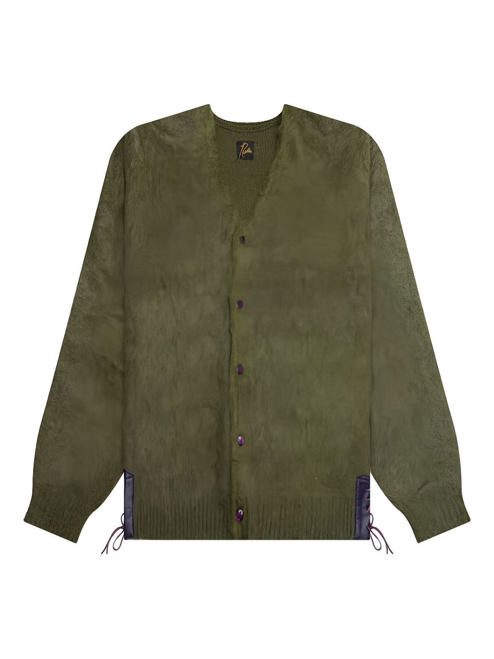 leather-patch cardigan Highlights - Olive green - Purple leather patches - Lace-up detailing - Front button fastening - Elbow patches Imported Composition Mohair 55%, Nylon 30%, Wool 15% Washing instructions Read Manufacturer Guidelines