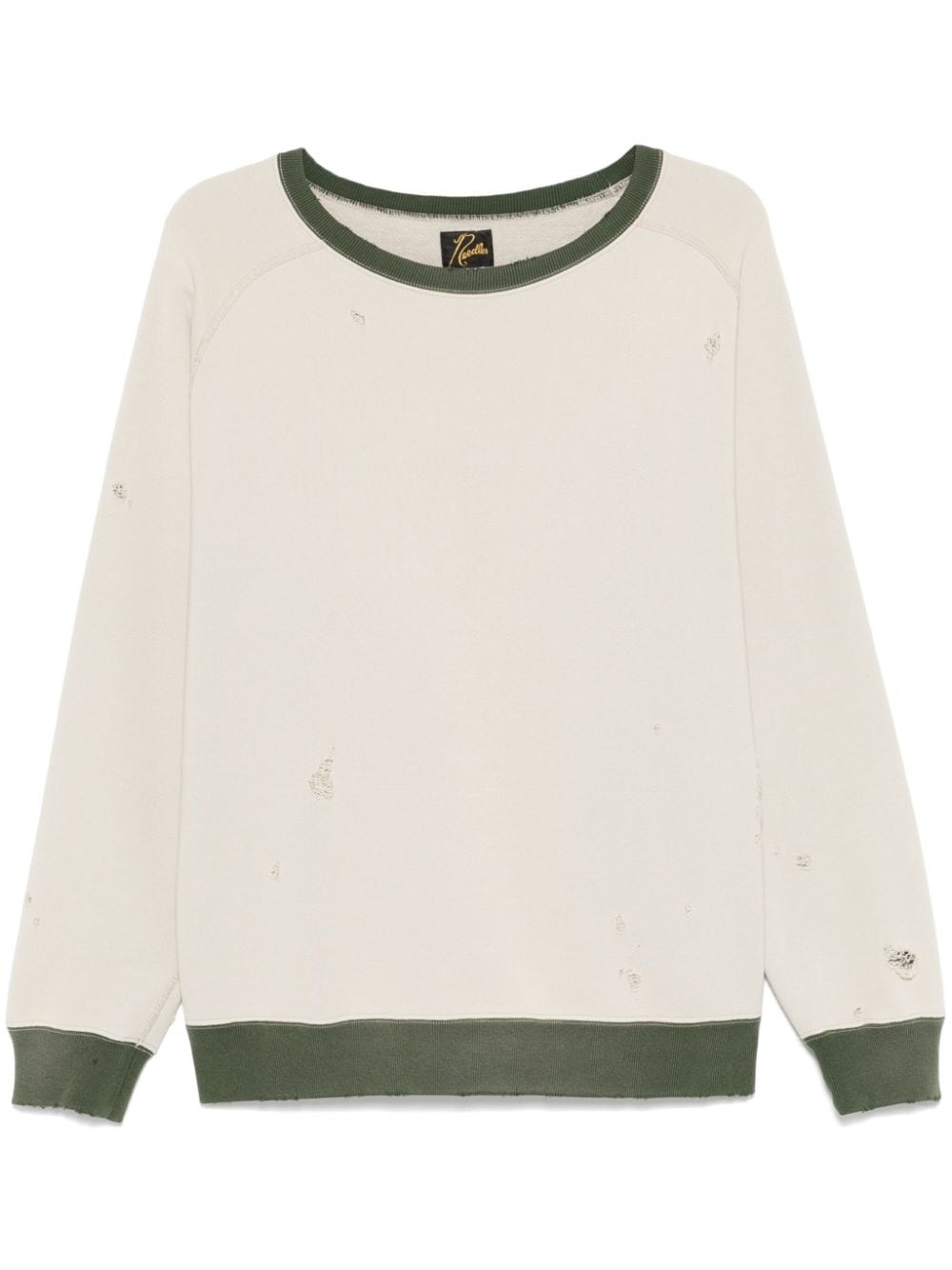 ripped sweatshirts Highlights - Ecru/fern green - Cotton - Jersey texture - Colour-block panelled design - Ripped detailing - Crew neck - Long raglan sleeves - French terry lining - Ribbed cuffs and hem Imported Composition Cotton 100% SIZE & FIT Model measurements Height 6 ft 2 in(1.87 m) Bust/Chest 37.79 in(96 cm) Hips 37.79 in(96 cm) Waist 30.31 in(77 cm) FittingInformation Designed for a relaxed fit, this piece allows for comfort and movement when worn Made from a midweight non-stretch fabric, this piece offers minimal elasticity when worn