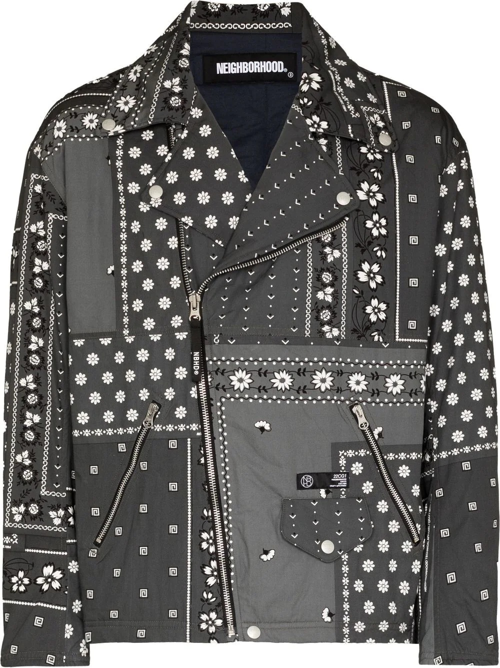 bandana-print biker jacket Neighborhood's biker jacket is defined by its bold bandana pattern print, drawing inspiration from Americana motorcycle culture. Produced in a panelled design the style is complete with a diagonal front zip fastening. Imported Composition Outer: Polyester 100%, Cotton 100% Lining: Cotton 100% SIZE & FIT Model measurements Height 6 ft 2 in(1.89 m) Bust/Chest 37.79 in(96 cm) Hips 37 in(94 cm) Waist 30.31 in(77 cm) Washing instructions Hand Wash