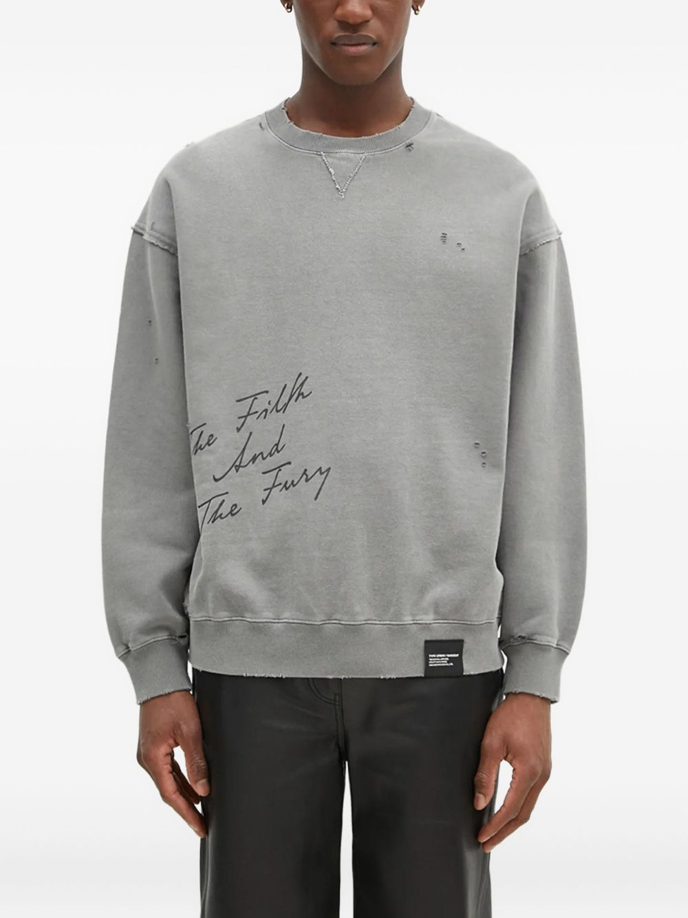 distressed crew neck sweatshirt Highlights - Grey - Distressed effect - Crew neck - Print - Long sleeves - Ribbed hem and cuffs Imported Composition Cotton 100% Washing instructions Read Manufacturer Guidelines