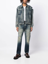 distressed-effect denim jacket indigo blue cotton distressed effect classic collar front button fastening long sleeves buttoned cuffs two chest patch pockets straight hem Imported Composition Cotton 100% SIZE & FIT Model measurements Height 6 ft 2 in(1.88 m) Bust/Chest 31.88 in(81 cm) Hips 35.82 in(91 cm) Waist 27.55 in(70 cm) FittingInformation This piece fits true to size. We recommend you get your regular size Cut for a loose fit Made with a mid-weight fabric Measurement CHEST 46.45 in(118 cm) SLEEVE LENGTH 31.69 in(80.5 cm) LENGTH 23.62 in(60 cm) Shoulder Width 19.88 in(50.5 cm)