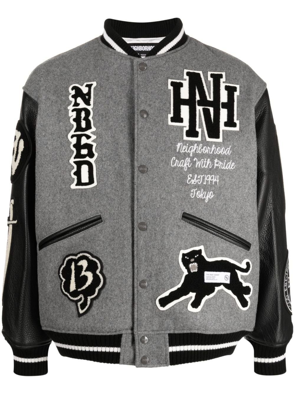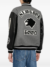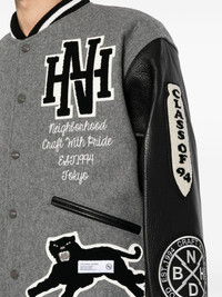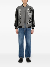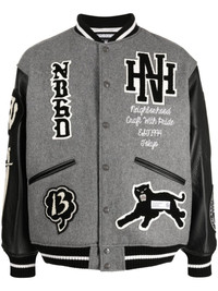 logo-patch varsity jacket Highlights - Grey/black/white - Wool blend - Leather - Patchwork design - Stand-up collar - Press-stud fastening - Long sleeves - Striped edge - Two side slit pockets Imported Composition Outer: Wool 90%, Nylon 10% Lining: Polyester 100% Sleeve: Calf Leather 100% SIZE & FIT Model measurements Height 6 ft 2 in(1.87 m) Bust/Chest 34.25 in(87 cm) Hips 36.22 in(92 cm) Waist 29.52 in(75 cm) FittingInformation Designed to be unstructured, offering a loose fit throughout The elasticated hem allows for movement and a comfortable fit Made from a heavyweight non-stretch fabric This piece fits true to size – take your usual size Washing instructions Dry Clean Only