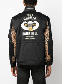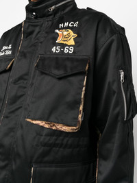 M-65 padded jacket black cotton embroidered motif embroidered slogan band collar concealed front fastening long sleeves sleeve zip pocket front flap pockets straight hem Made in Italy Composition Outer: Rayon 100%, Cotton 50%, Polyester 50% Lining: Cotton 100%, Polyester 100% SIZE & FIT Model measurements Height 6 ft 2 in(1.87 m) Bust/Chest 36.22 in(92 cm) Hips 37 in(94 cm) Waist 27.95 in(71 cm) FittingInformation This piece fits true to size. We recommend you get your regular size Cut for a loose fit Made with a mid-weight non-stretch fabric Washing instructions Dry Clean Only