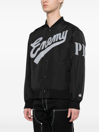 x Public Enemy x Majestic logo-embroidered bomber jacket Highlights - Black - Embroidered logo to the front, rear, and at the sleeve - Ribbed band collar - Front press-stud fastening - Long sleeves - Two press-stud fastening side pockets - Ribbed cuffs and hem Made in France Composition Filling: Polyester 100% Outer: Polyester 100% Lining: Polyester 100% Trims: Polyester 100% SIZE & FIT Model measurements Height 6 ft 2 in(1.89 m) Bust/Chest 37.4 in(95 cm) Hips 36.61 in(93 cm) Waist 28.34 in(72 cm) Measurement CHEST 50.39 in(128 cm) SLEEVE LENGTH 25.59 in(65 cm) LENGTH 27.16 in(69 cm) Shoulder Width 21.65 in(55 cm) FittingInformation Designed to be unstructured, offering a loose fit throughout The ribbed hem offers a close, comfortable fit Made from a padded non-stretch fabric, giving it no natural elasticity This piece fits true to size – take your usual size Washing instructions Dry Clean Only