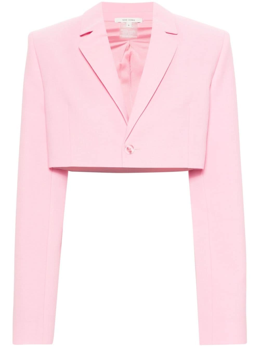 cropped blazer Highlights - Light pink - Interwoven design - Dart detailing - Notched lapels - Shoulder pads - Long sleeves with split cuffs - Front button fastening - Cropped - Straight hem - Full lining Made in Italy Composition Polyester 53%, Virgin Wool 43%, Elastane 4% SIZE & FIT Model measurements Height 5 ft 9 in(1.74 m) Bust/Chest 34.64 in(88 cm) Hips 36.61 in(93 cm) Waist 26.37 in(67 cm) FittingInformation Designed for a boxy fit, intended for a loose fit throughout The internal shoulder pads offer a structured shape Made from a midweight fabric This piece fits true to size – take your usual size
