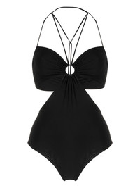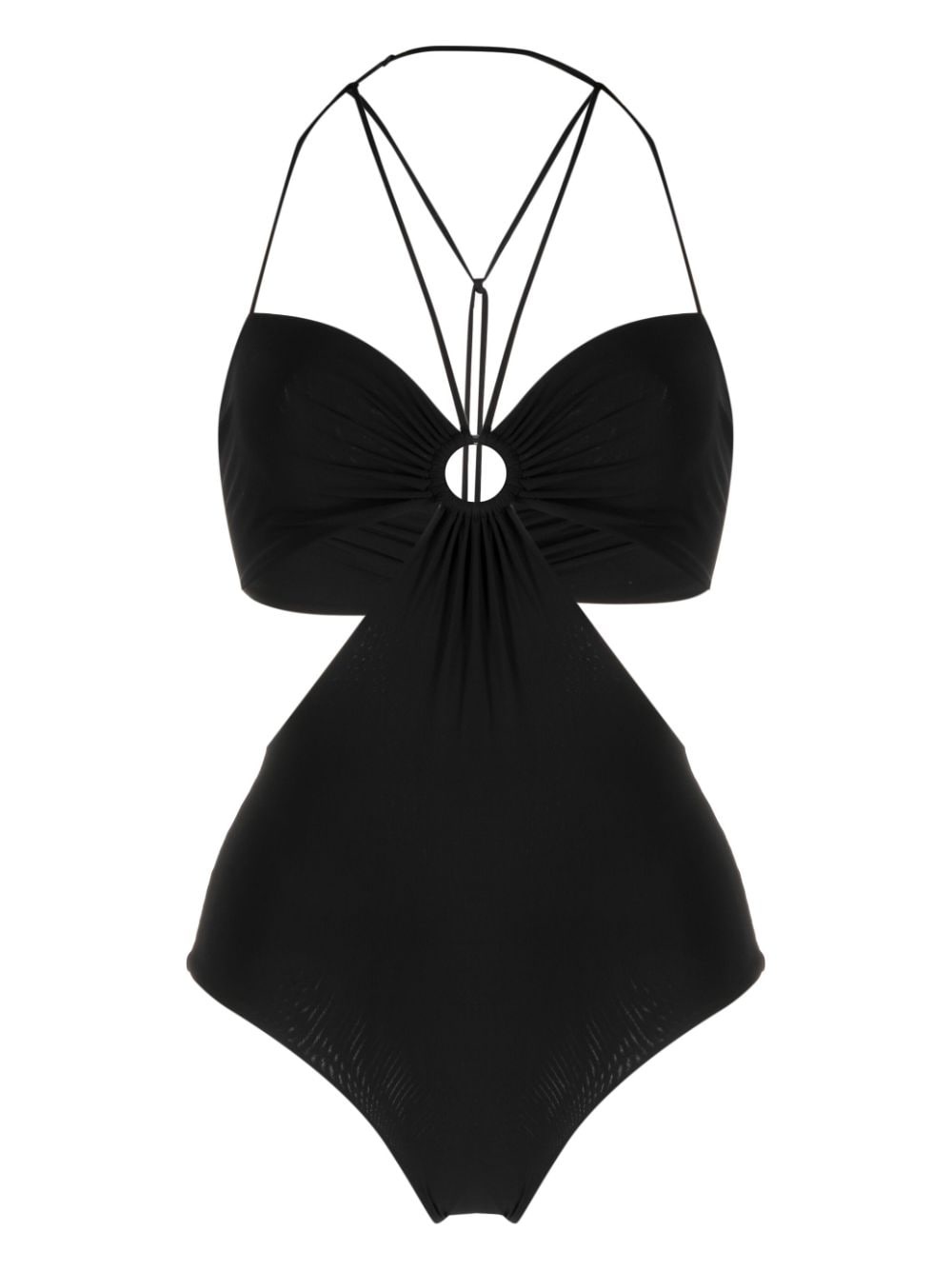 cut-out swimsuit This black swimsuit by Nensi Dojaka reflects the brand's confident attitude with its cut-out design and gathered detailing. Highlights - Black - Stretch-design - Cut-out detailing - Gathered detailing - Thin shoulder straps - Sleeveless - Be mindful to try on swimwear over your own garments. Made in Italy Composition Polyester 72%, Spandex/Elastane 28% Washing instructions Dry Clean Only