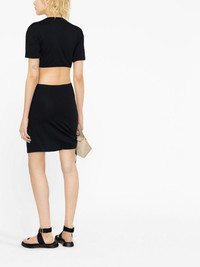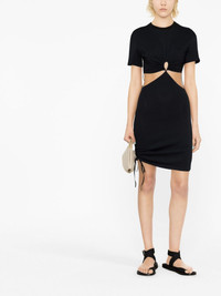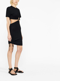 cut-out T-shirt dress Nensi Dojaka's SS23 collection is informed by '90s-era minimalism. A case in point, this black dress is crafted to a T-shirt-like silhouette and elevated by cut-outs. Side ties at the hem add a customisable element. Highlights - Black - Cotton - Cut-out detailing - Crew neck - Short sleeves - Side tie fastening - Thigh-length - Straight hem Made in Italy Composition Cotton 100% SIZE & FIT Model measurements Height 5 ft 10 in(1.79 m) Bust/Chest 31.49 in(80 cm) Hips 35.03 in(89 cm) Waist 23.62 in(60 cm) Measurement Shoulder Width 18.5 in(47 cm) LENGTH 37.4 in(95 cm) WAIST 24.4 in(62 cm) BUST 33.85 in(86 cm) FittingInformation Designed for a close fit throughout Made from a lightweight non-stretch fabric, this piece offers minimal elasticity when worn This piece fits true to size – take your usual size Washing instructions Hand Wash