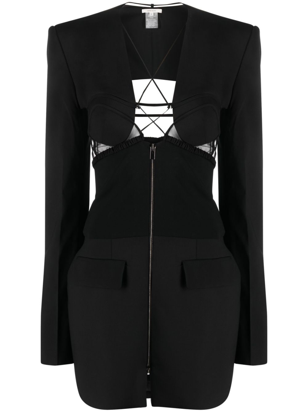 cut-out wool minidress This minidress spotlights Nensi Dojaka’s penchant for clean lines that ‘create a graphic play on the body’. Tailored from a wool blend, it’s detailed with mesh panels and slender straps at the front and back, evoking the brand’s lingerie inspiration. Highlights - Black - Virgin wool blend - Cut-out detailing - Mesh panelling - Plunging u-neck - Front zip fastening - Long sleeves - Two front flap pockets - Straight hem Made in Italy Composition Outer: Virgin Wool 98%, Spandex/Elastane 2% Lining: Viscose 100% SIZE & FIT Model measurements Height 5 ft 10 in(1.77 m) Bust/Chest 32.67 in(83 cm) Hips 37 in(94 cm) Waist 27.55 in(70 cm) FittingInformation Designed for a slim fit that sits just away from the body offering a close yet comfortable fit The internal shoulder pads offer a structured shape Made from a midweight stretch fabric, this piece offers elasticity and flexibility when worn This piece fits true to size – take your usual size Washing instructions Dry Clean Only