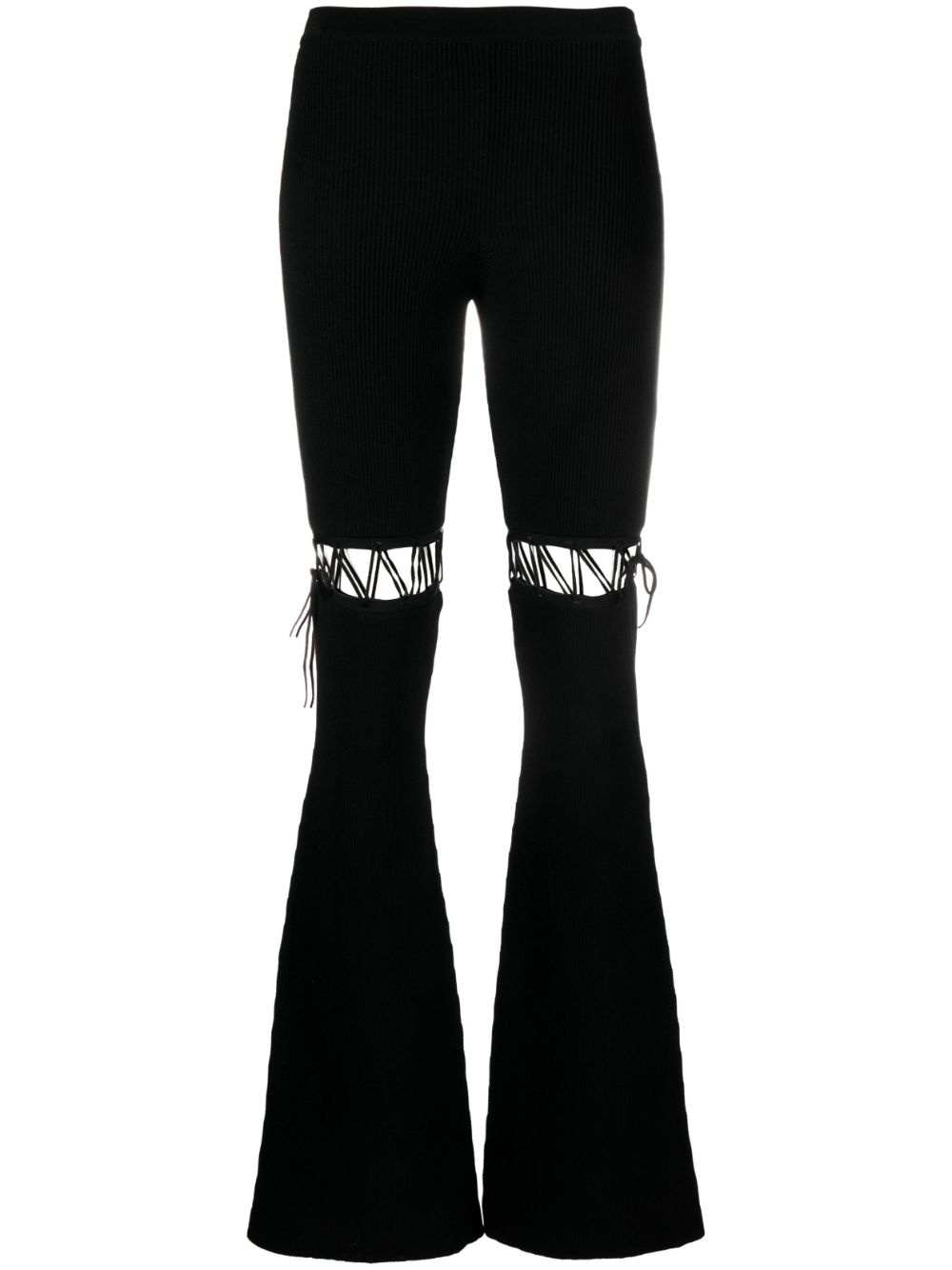 lace-up ribbed trousers These black Nensi Dojaka trousers blend the label's striking aesthetic with knitwear influences. Their ribbed, flared design is interrupted by lace-up details that create geometric cut-outs above the knees. Highlights - Black - Ribbed knit - Mid-rise - Lace-up detailing - Flared design Made in Italy Composition Viscose 82%, Polyester 17%, Polyamide 1% SIZE & FIT Model measurements Height 5 ft 11 in(1.8 m) Bust/Chest 33.07 in(84 cm) Hips 37.4 in(95 cm) Waist 25.19 in(64 cm) Measurement FRONT RISE 9.84 in(25 cm) HIPS 26.77 in(68 cm) WAIST 19.68 in(50 cm) FittingInformation Designed with a flared hem, these trousers allow for a close fit at the waist with a slim fit over the leg and widening towards the hem The elasticated waist allows for a comfortable fit Made from a midweight fabric This piece fits true to size – take your usual size Washing instructions Dry Clean Only