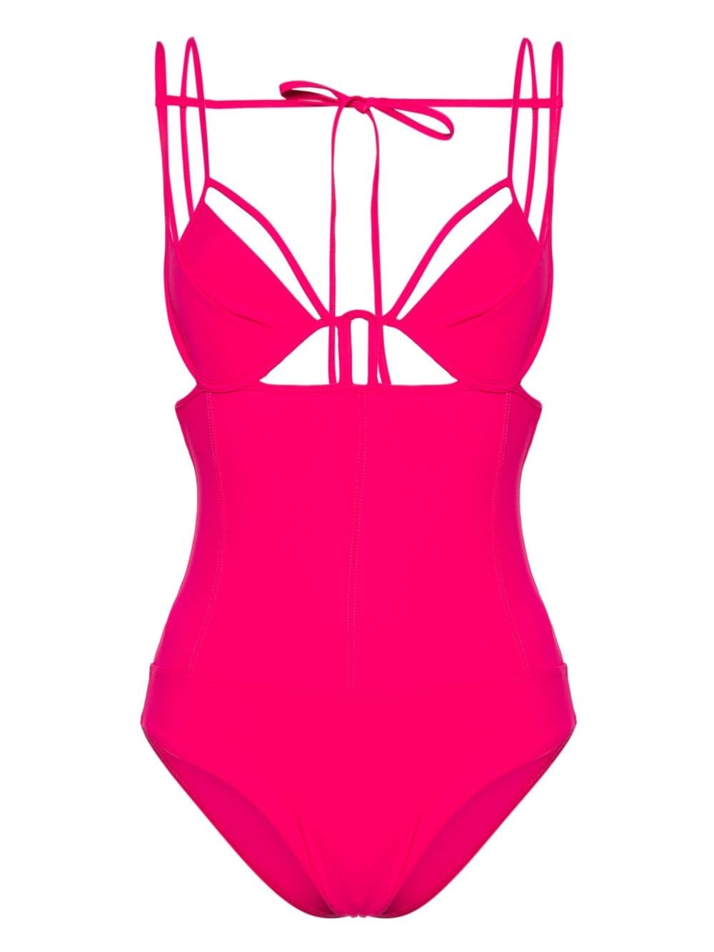 Mika swimsuit Highlights - Fuchsia pink - Stretch-design - Rear tie fastening - V-neck - Cut-out detailing - Double thin shoulder straps - Pads - Low back - Seam detailing - Be mindful to try on swimwear over your own garments. Imported Composition Microfibre 75%, Elastane 25%