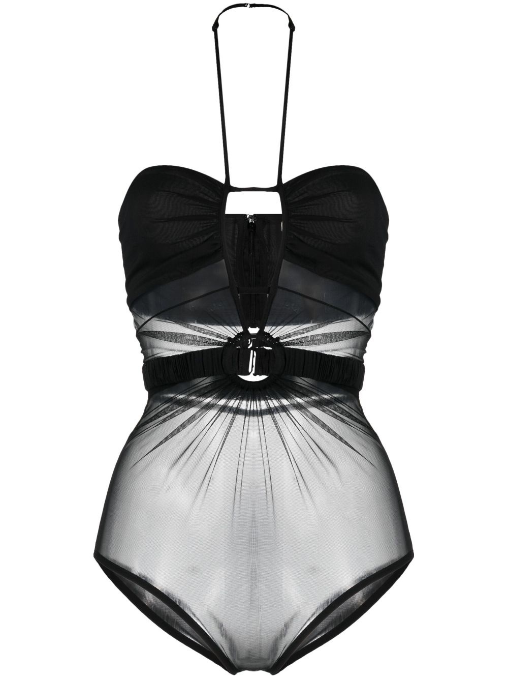 sheer-panel halterneck bodysuit Sheer detailing is a key element in Nensi Dojaka's daring design aesthetic. This black bodysuit features rounded cut-outs as well as transparent inserts around the panelled bust. Highlights - Black - Stretch-design - Sheer panelling - Cut-out detailing - Halterneck - Spaghetti straps - Just a reminder that this piece must be tried on over your own garments. Made in Italy Composition Viscose 84%, Spandex/Elastane 16% SIZE & FIT Model measurements Height 5 ft 10 in(1.77 m) Bust/Chest 29.92 in(76 cm) Hips 34.25 in(87 cm) Waist 23.62 in(60 cm) FittingInformation Designed for a close fit throughout Made from a lightweight stretch fabric, this piece offers elasticity and flexibility when worn This piece fits true to size – take your usual size Washing instructions Do Not Wash/Do Not Dry Clean