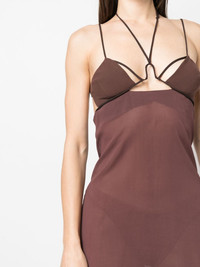 strap-detailing semi-sheer minidress Nensi Dojaka's daring designs are defined by a strong sense of identity, displayed in the way the designer uses cut-outs and transparencies. This minidress boasts a multi-strap triangle-cup top that falls into a semi-sheer skirt, embodying the brand's bold aesthetic. Made in Italy Composition Cotton 100% SIZE & FIT Model measurements Height 5 ft 10 in(1.77 m) Bust/Chest 30.7 in(78 cm) Hips 35.43 in(90 cm) Waist 23.62 in(60 cm) Measurement LENGTH 37 in(94 cm) WAIST 27.55 in(70 cm) BUST 29.92 in(76 cm) FittingInformation This piece fits true to size. We recommend you get your regular size Designed for a close fit at the bust, waist and hips Made with a lightweight non-stretch fabric Washing instructions Hand Wash
