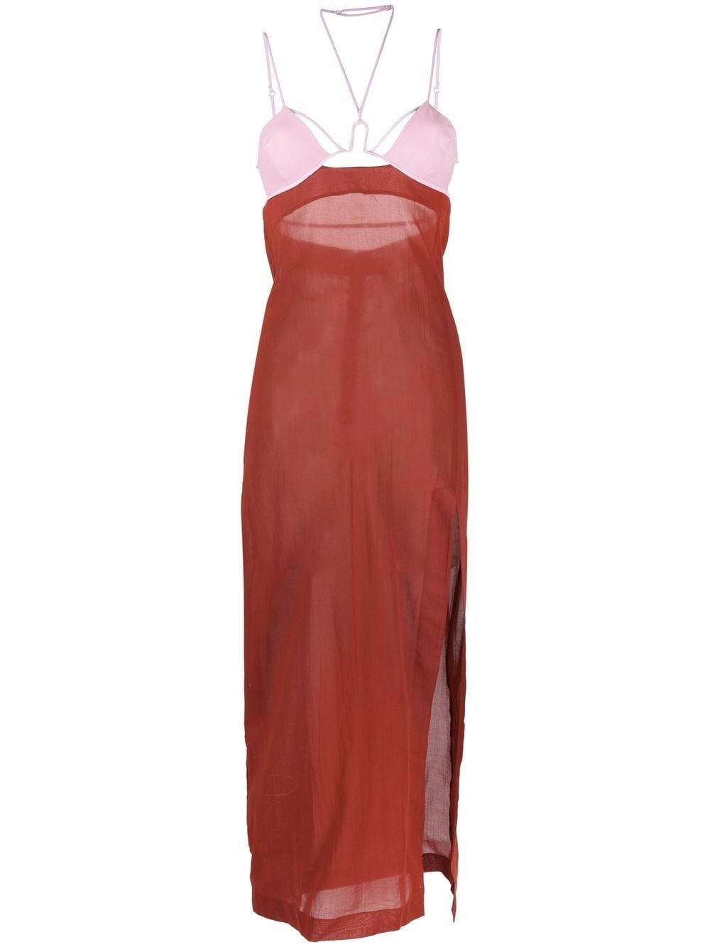 strappy sheer dress Lingerie-inspired silhouettes and sheer fabrics are synonymous with Nensi Dojaka's creations, as illustrated by this maxi dress for SS23. In a soft pink and rust red colourway, this semi-sheer construction is enhanced with delicate straps that outline two moulded bra cups and secure the garment by the neck. Made in Italy Composition Cotton 100% SIZE & FIT Model measurements Height 5 ft 10 in(1.78 m) Bust/Chest 33.07 in(84 cm) Hips 36.61 in(93 cm) Waist 24.8 in(63 cm) FittingInformation This piece fits true to size. We recommend you get your regular size Designed for a close fit at the bust, waist and hips Made with a lightweight non-stretch fabric