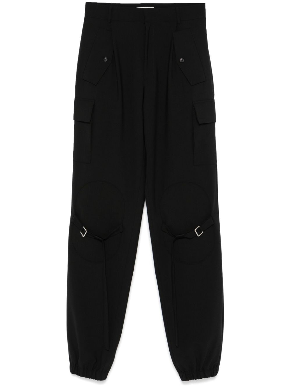 tapered cargo trousers Highlights - Black - Hook and zip fly fastening - Belt loops - Two side flap pockets - Two side cargo pockets - Built-in kneepads - Adjustable straps - Elasticated ankles - Tapered leg Made in Italy Composition Polyester 53%, Virgin Wool 43%, Elastane 4% SIZE & FIT Model measurements Height 5 ft 9 in(1.75 m) Bust/Chest 31.88 in(81 cm) Hips 34.64 in(88 cm) Waist 24.01 in(61 cm) FittingInformation Designed for a relaxed tapered cut, these trousers allow for a close fit at the waist and offer a loose fit at the thighs, with a closer fit toward the ankles Made from a midweight stretch fabric, this piece offers elasticity and flexibility when worn