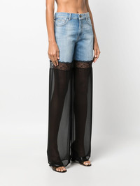 tulle-panel straight-leg jeans Albanian designer Nensi Dojaka favours lingerie-inspired silhouettes. Illustrating that approach, these jeans boast a semi-sheer tulle panel and lace trimming for a provocative take on the classic straight-leg silhouette. Highlights - Black/blue - Cotton - Denim - Tulle panel - Lace trim - Belt loops - Concealed fly and button fastening - Classic five pockets - Straight leg Made in Italy Composition Polyester 100%, Cotton 100% SIZE & FIT Model measurements Height 5 ft 10 in(1.78 m) Bust/Chest 33.07 in(84 cm) Hips 36.61 in(93 cm) Waist 24.8 in(63 cm) FittingInformation Designed with a wide leg cut, these jeans allow for a close fit at the waist and offer a loose and roomy fit over the leg Sturdy and hard-wearing, this denim piece offers no stretch This piece fits true to size – take your usual size Washing instructions Hand Wash