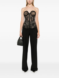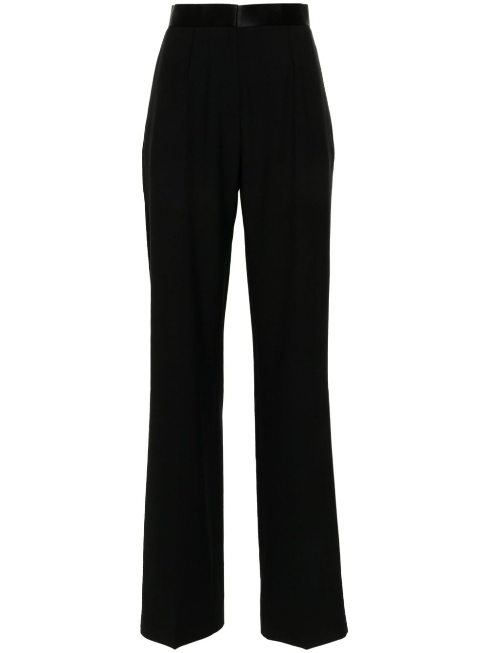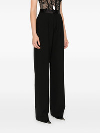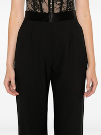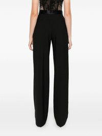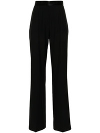 wide-leg tailored trousers Highlights - Black - Virgin wool blend - Satin trim - Pressed crease - Two side inset pockets - Wide leg - Concealed front button, hook and zip fastening Made in Italy Composition Polyester 53%, Virgin Wool 43%, Elastane 4% SIZE & FIT Model measurements Height 5 ft 9 in(1.75 m) Bust/Chest 31.88 in(81 cm) Hips 34.64 in(88 cm) Waist 24.01 in(61 cm) FittingInformation Designed with a wide-leg cut, these trousers allow for a close fit at the waist and offer a loose and roomy fit over the leg Made from a midweight stretch fabric, this piece offers elasticity and flexibility when worn This piece fits true to size – take your usual size
