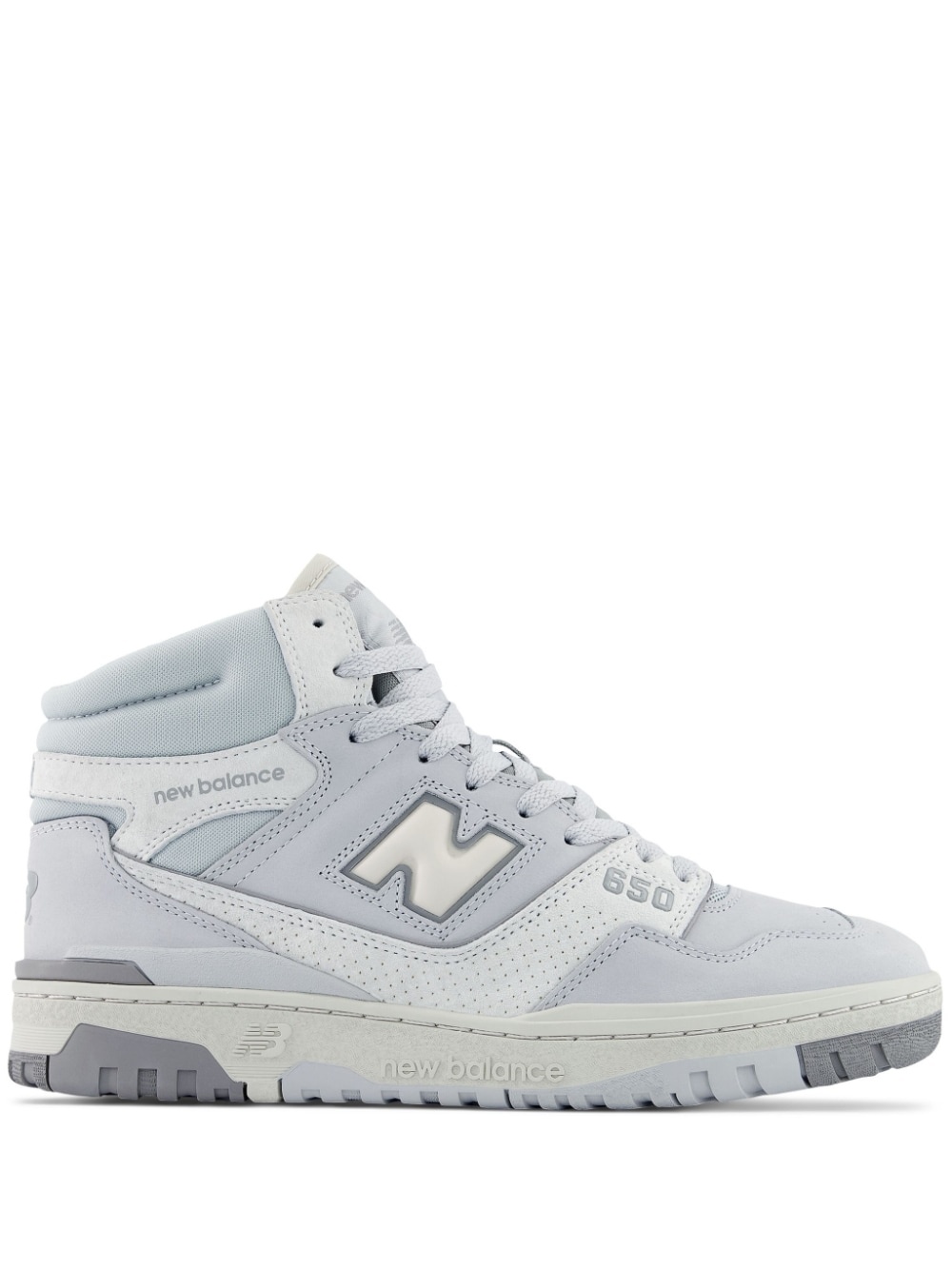 650 "Light Aluminum" sneakers NEW BALANCE adds a high-top counterpart to the iconic 550 silhouettes to create the 650 sneakers. The streamlined construction features suede panels and signature branding, echoing the label's branded style. Highlights - Blue-grey - Leather - Embossed logo to the side - Logo print to the side and rear - Logo patch at the tongue - Ankle-length - Front lace-up fastening - Round toe - Branded insole - Flat rubber sole Made in United Kingdom Composition Outer: Calf Leather 100% Sole: Rubber 100% Lining: Fabric 100% SIZE & FIT Measurement HEEL 1.57 in(4 cm) HEIGHT 3.54 in(9 cm) Sole height 1.18 in(3 cm)