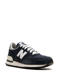 990 v1 "Navy/White" sneakers Crafted in a navy blue-hued suede design, the 990v1 sneakers from New Balance are adorned with a silver-tone heel counter and the label's signature logo patch to the sides. The chunky rubber heel offers a comfortable feel to the pair. Highlights - Navy blue - Suede - Mesh panelling - Logo patch to the side - Contrasting heel counter - Round toe - Front lace-up fastening - Logo patch at the tongue - Branded insole - Rubber sole - These styles are supplied by a premium sneaker marketplace. stocking only the most sought-after footwear, they source and curate some of the most hard to find sneakers from around the world. Imported Composition Suede 100% SIZE & FIT Measurement HEEL 1.96 in(5 cm) Sole height 0.78 in(2 cm)