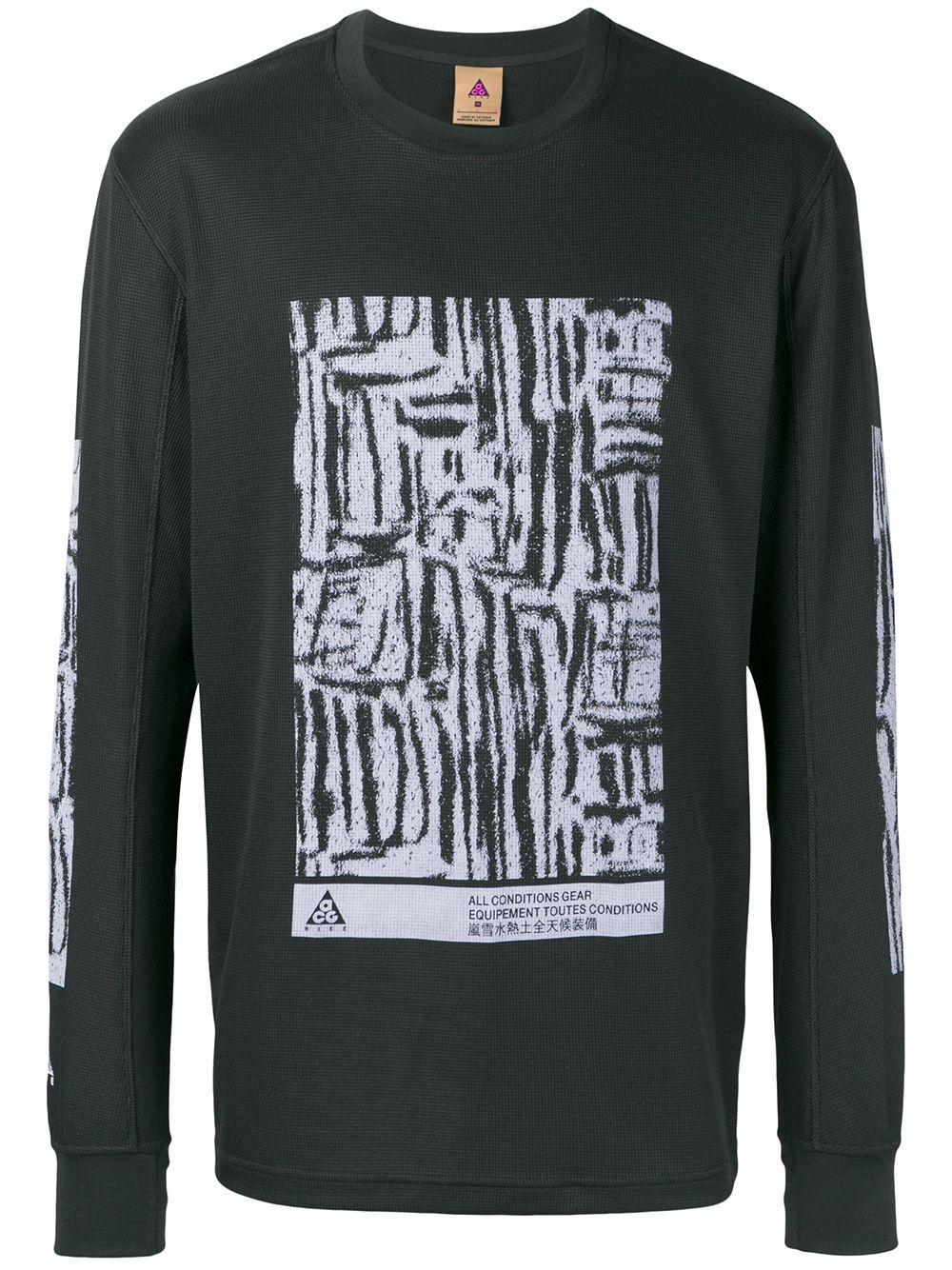 ACG long-sleeved top Founded in 1964 by Bill Bowerman and Phil Knight, sportswear conglomerate Nike is a pioneering sportswear label with technical innovation and contemporary design at its core. Black wool blend ACG long-sleeved top from Nike featuring a round neck, an abstract print, long sleeves, fitted cuffs and a straight hem. Imported Composition Polyester 91%, Wool 5%, Spandex/Elastane 4% SIZE & FIT Model measurements Height 6 ft 2 in(1.87 m) Bust/Chest 38.18 in(97 cm) Hips 36.61 in(93 cm) Waist 29.13 in(74 cm) Washing instructions Machine Wash