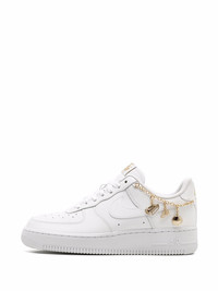 Air Force 1 '07 LX "Lucky Charms" sneakers The Nike Air Force 1 Low “Lucky Charms” is a women’s version of the retro basketball shoe in a white-based colourway that features added jewellery on its design. In this version, the entire upper, including the perforated toe, overlay panels, and Swoosh branding, are designed in white leather. Contrasting metallic gold 'Nike Air' and Swoosh detailing are embroidered on the heel and printed on the white nylon tongue tag. A metallic gold chain with Nike-adjacent charms is found on the collar. Imported Composition Leather 100%