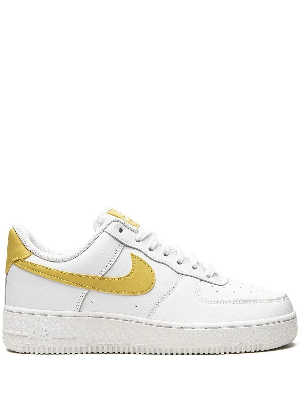 Nike Air Force 1 Low "White / Saturn Gold" sneakers Designed to represent movement and speed, the Nike Swoosh is a brand mainstay. It appears in a contrasting mustard yellow tone to the side of these Air Force 1 sneakers. Imported Composition Leather 100% SIZE & FIT Measurement HEEL 1.37 in(3.5 cm) Sole height 0.98 in(2.5 cm)